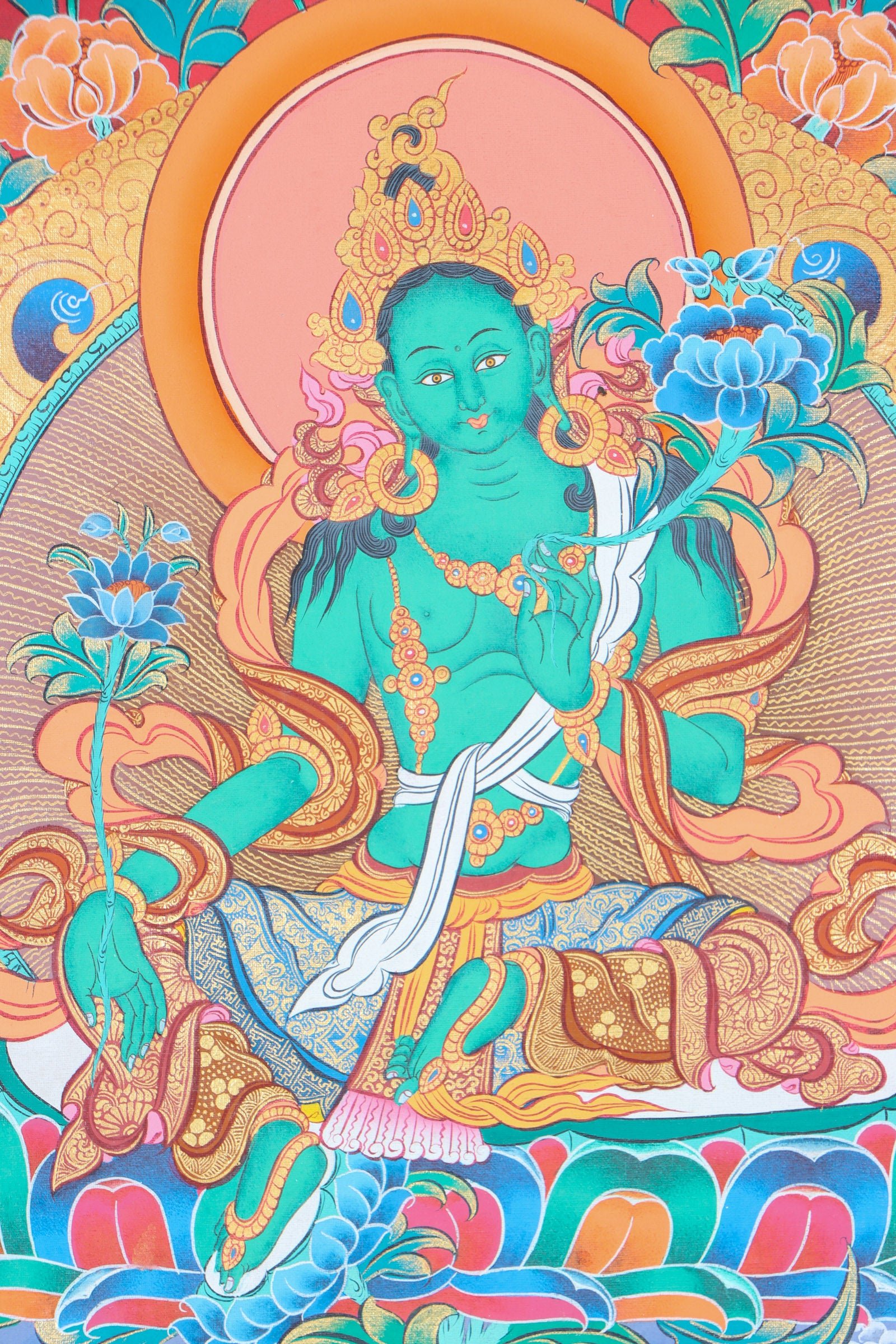 Tibetan artists expertly create 21 Tara Thangkas, emphasizing delicate brushstrokes, exacting details, and the application of mineral pigments, water, glue, and gold dust with meticulous adherence to the traditional iconographic guidelines.