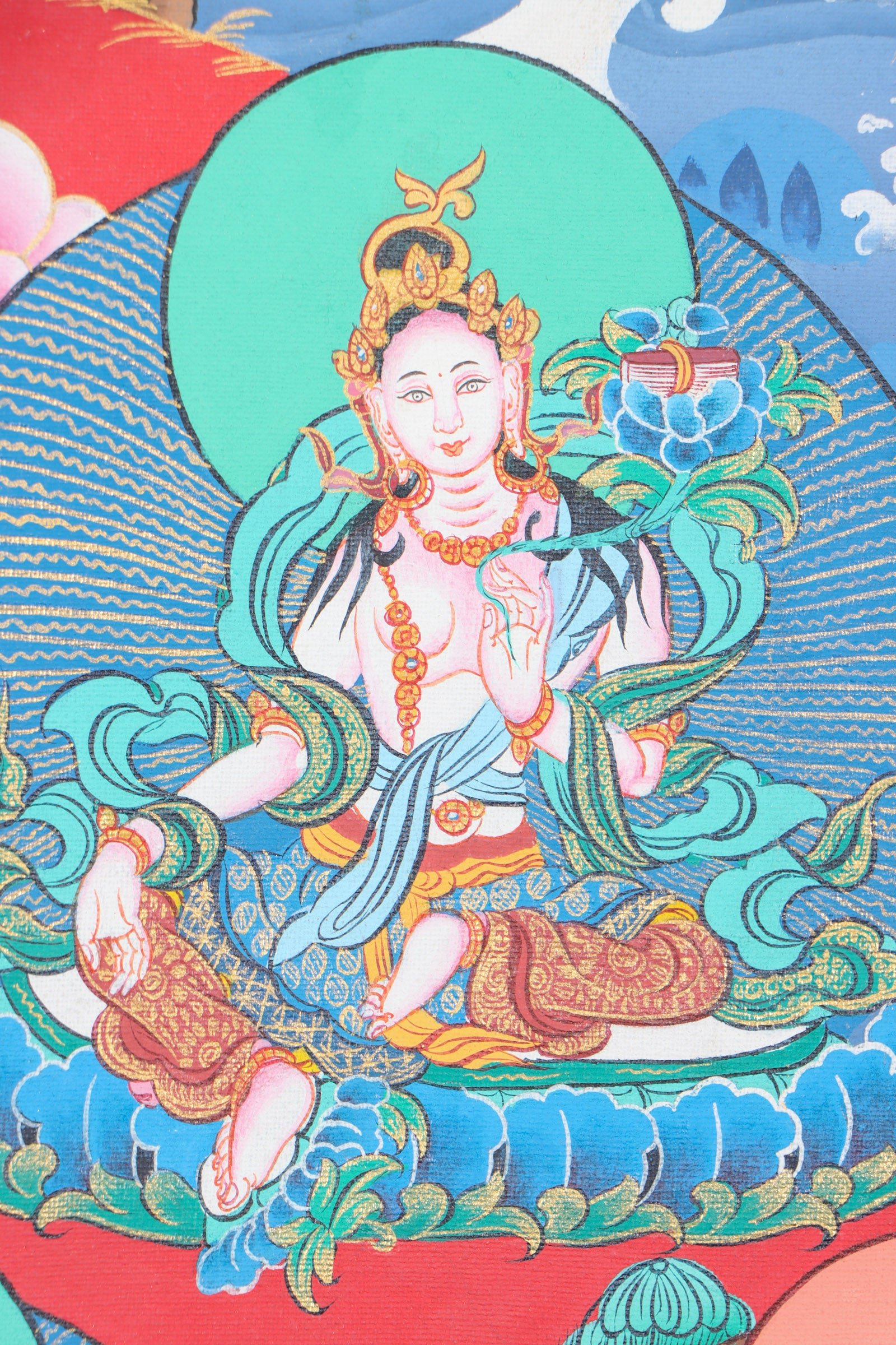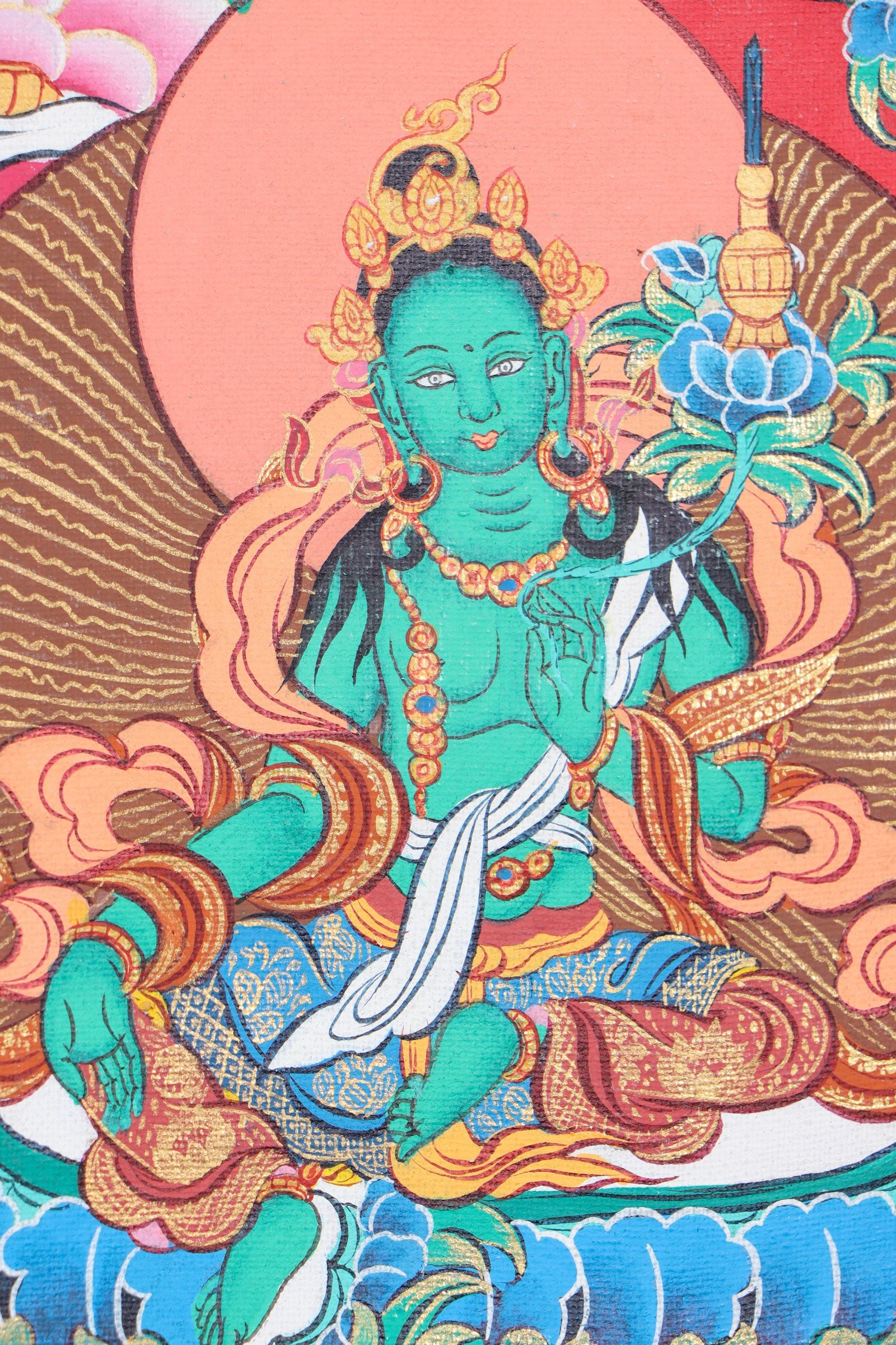 This 21 Tara Thangka Painting presents 20 depictions of Green Tara in the central position, unified by their expressive meditative pose. Each Shantidevi is distinct in her color, posture and meaning, while emanating a unified compassionate aura. The intricate design of this thangka further features additional Buddhist imagery such as lotuses, divine figures and clouds. This traditional artwork is an ideal way to discover the different facets of Tara while learning its history and symbolism. An outstanding piece to commence your meditation practice.