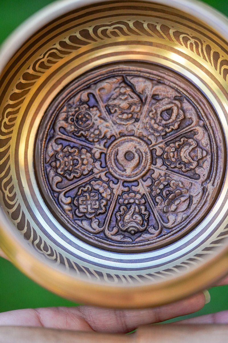 This beautifully handcrafted singing bowl features the 8 Auspicious Symbols of Tibetan Buddhism, each representing blessings of protection, wisdom, and prosperity. Handmade in Nepal by skilled artisans, this bowl produces a deep, calming tone ideal for meditation, healing, and spiritual practice.