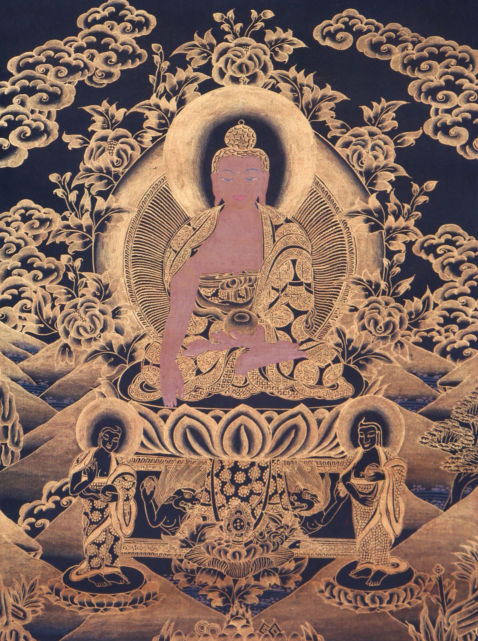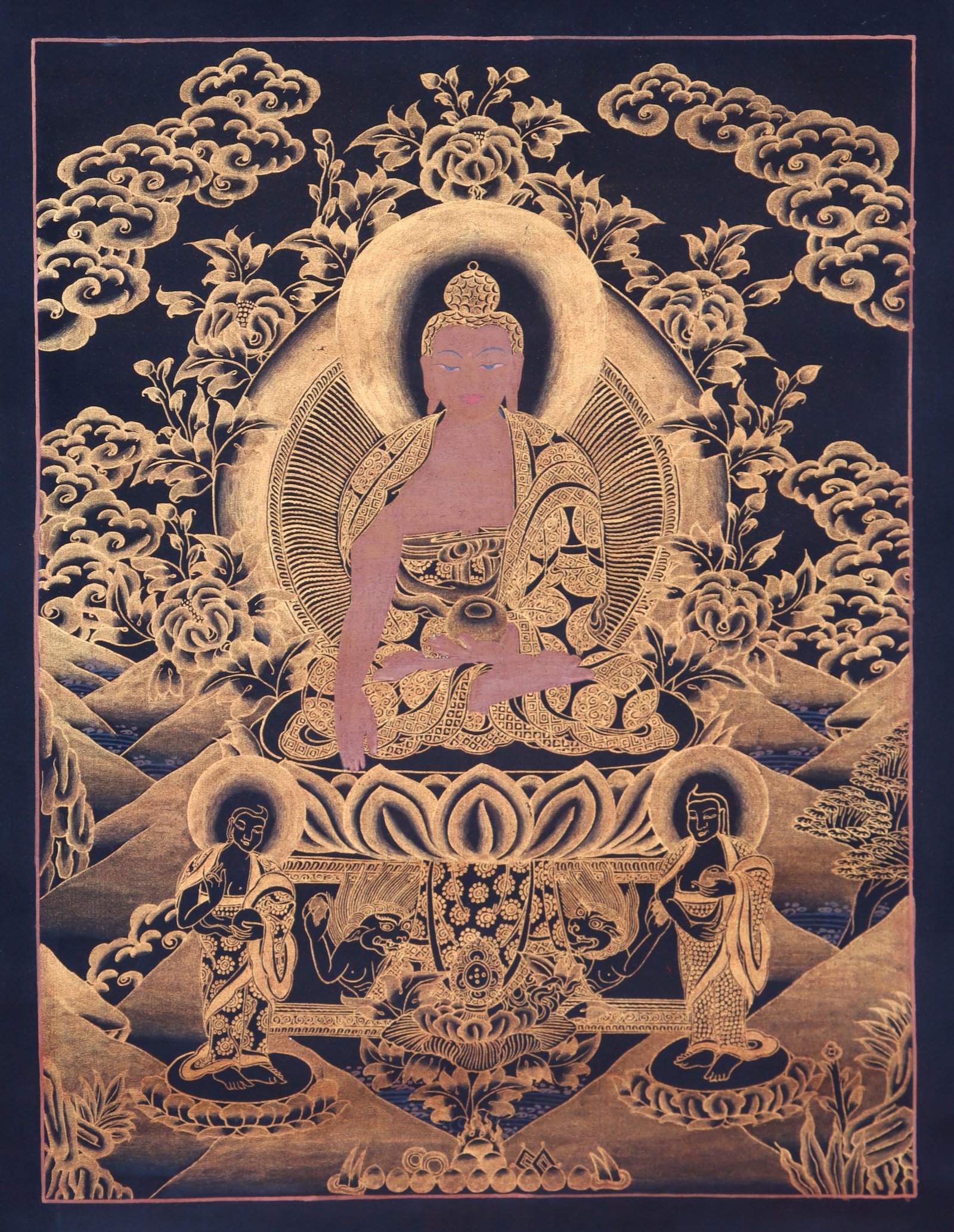 A Antique Shakyamuni Buddha Thangka is a Tibetan Buddhist painting that depicts the life and teachings of Siddhartha Gautama, otherwise known as Sakyamuni Buddha. Traditionally, this Thangka are held sacred, expressing Buddhist spirituality in an artistic manner. At the center of this Thangka is an image of the Buddha Sakyamuni in a meditative or teaching posture, recognizable from his elongated earlobes, topknot, and peaceful countenance. Accompanying this image are depictions of bodhisattvas.