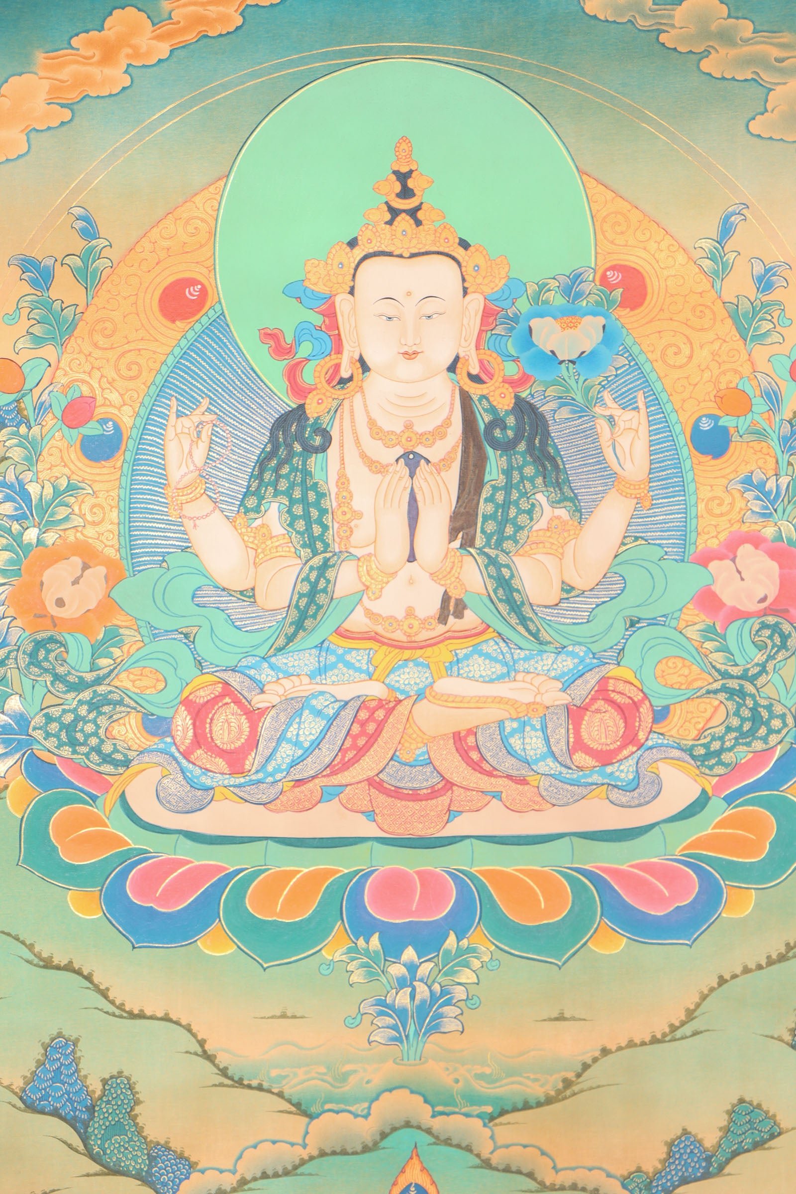 Thangka Art (Painting) are selected for the desired state of mind or qualities to embody. Visualizing a deity, like Chenrezig, creates a connection between the individual and the divine. Meditation cultivates the deity’s qualities and brings them inwards. The artisan’s skill is seen in the use of natural stone colors, enhancing the artwork’s beauty.