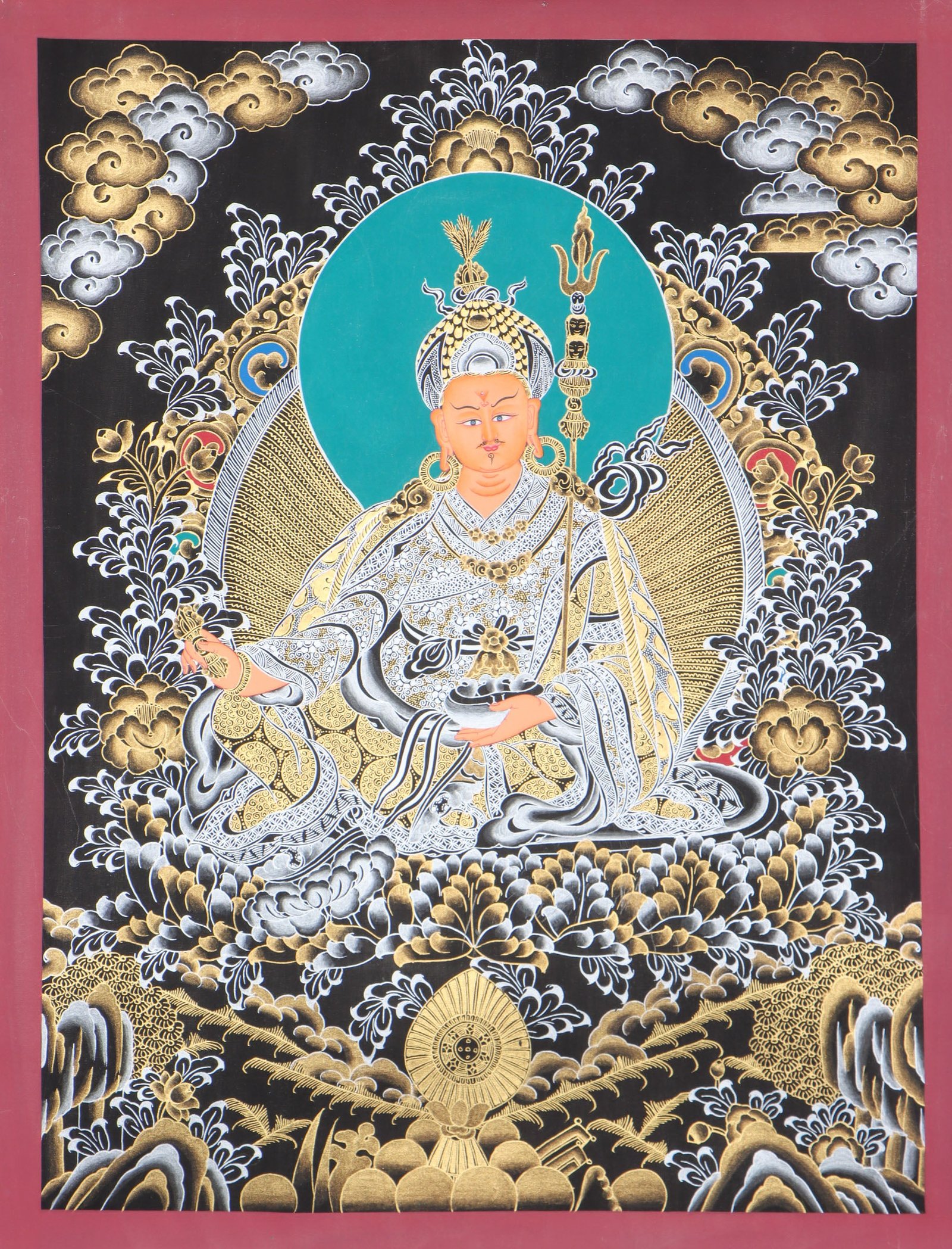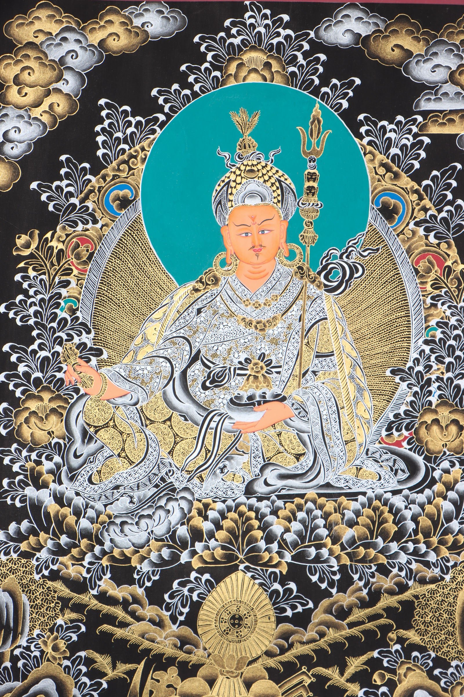 Guru Rinpoche Thangka depict the figure in a traditional seated pose, sitting atop a lush lotus flower. He has an expression of serenity, and is dressed in fine clothing, bedecked in various jewelry. His right hand is making the ‘abhaya mudra’, which symbolizes protection and his left hand holds a powerful vajra. Moreover, Guru Rinpoche thangkas often display his eight glimmering forms as well as mantra symbols and sacred phrases associated with him.