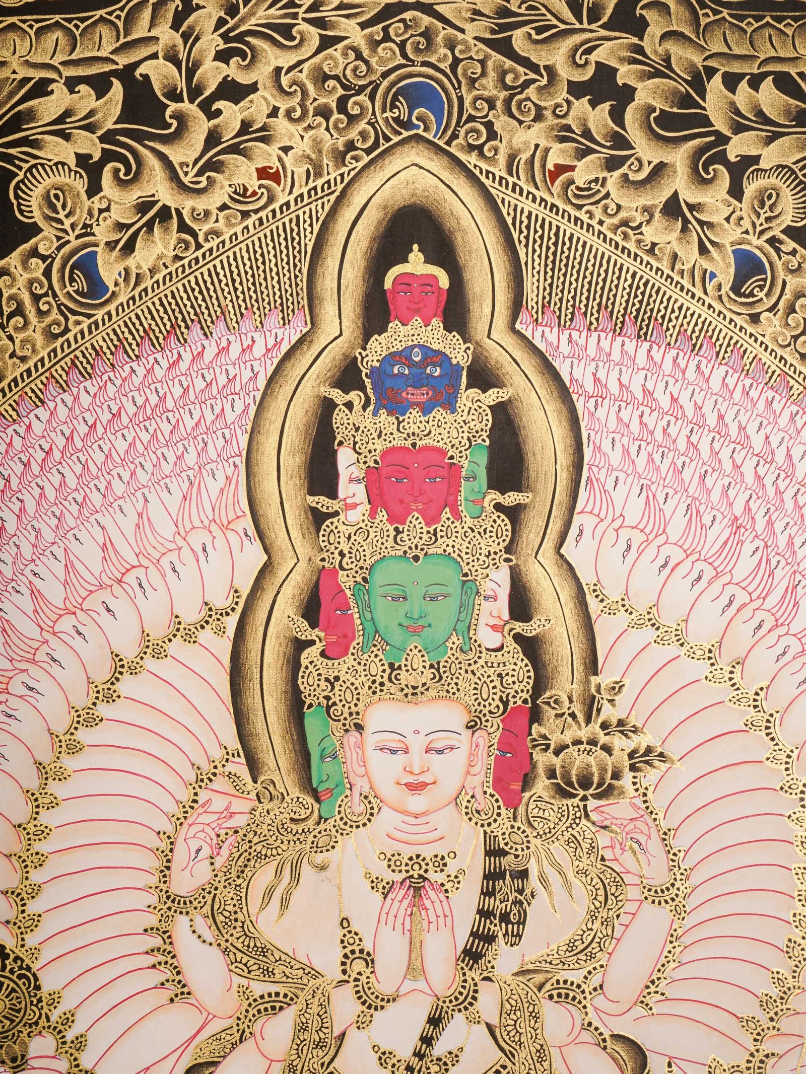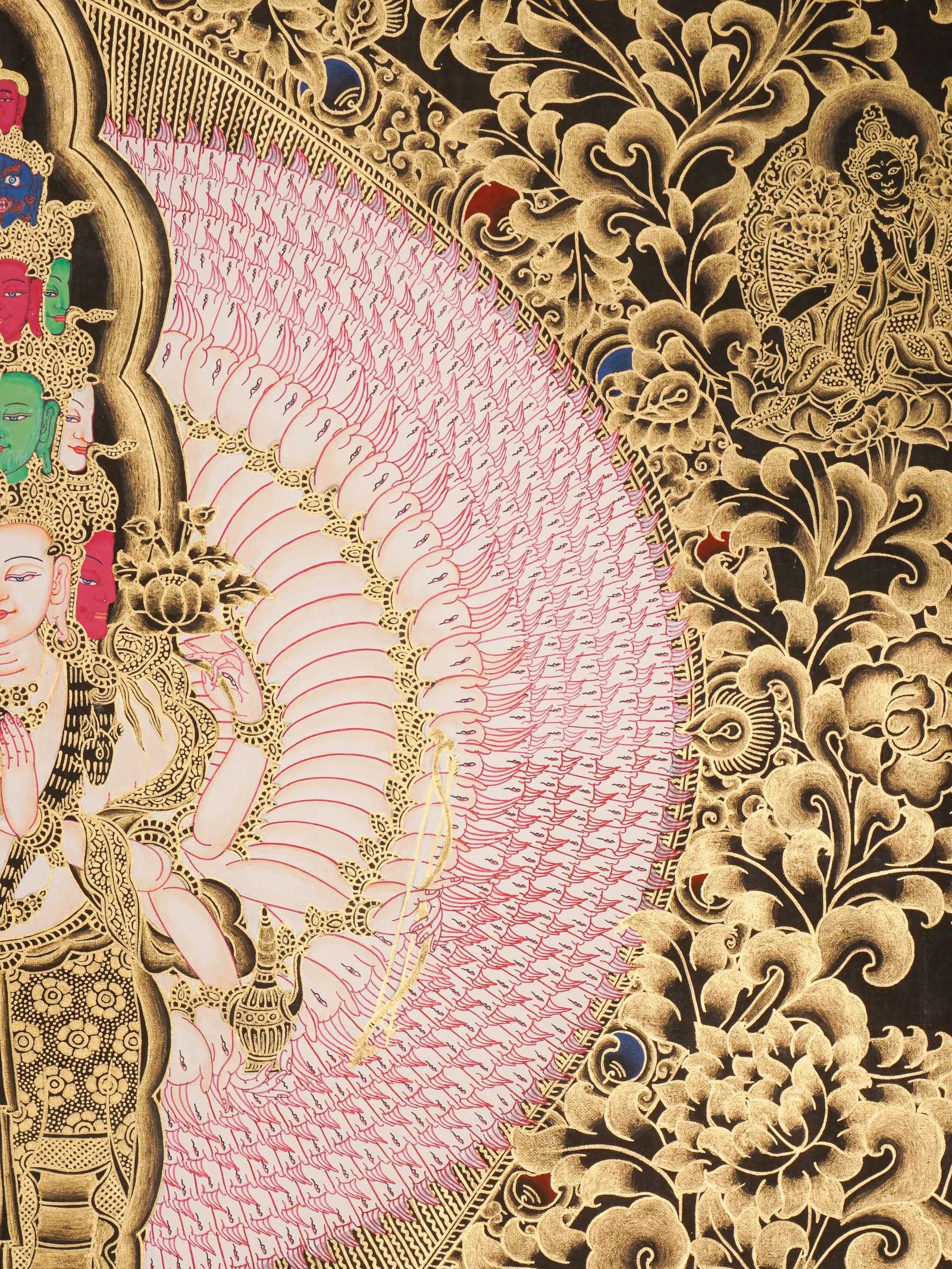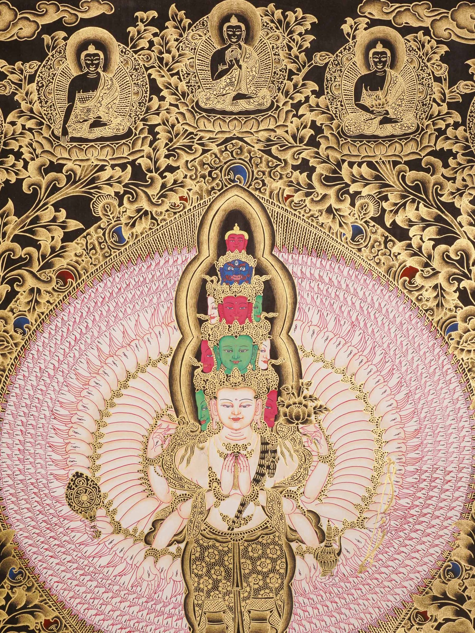 - Central Figure: Avalokiteshvara is often shown with four or a thousand arms, holding symbols like a lotus flower, rosary, vase, and jewel. The bodhisattva is portrayed in a meditative position, embodying calmness and compassion.