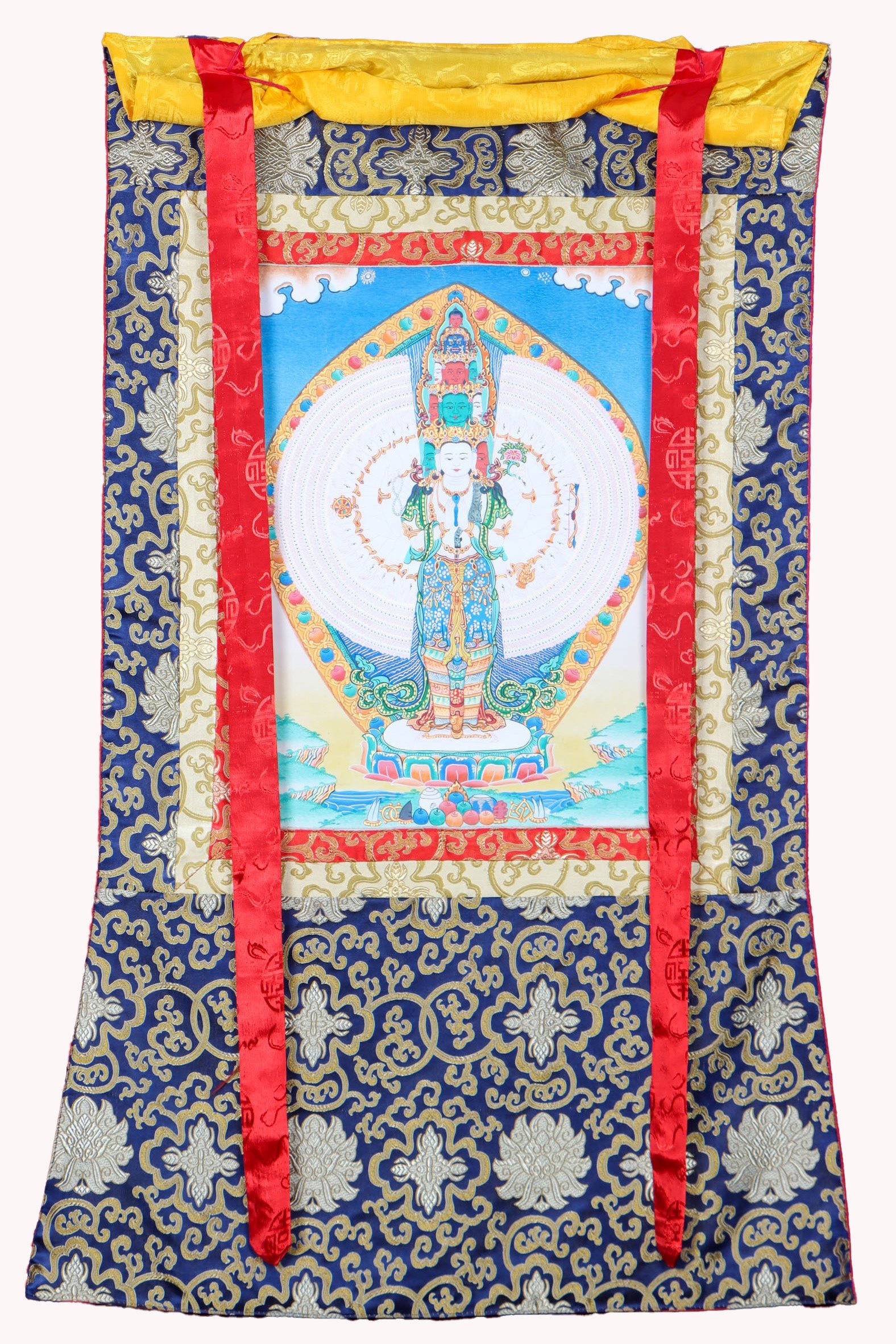 Avalokiteshvara Brocade thangka portrays the image of Avalokiteshvara in various forms and poses. Avalokiteshvara is often depicted with multiple arms and heads, symbolizing the ability to help beings in countless ways.