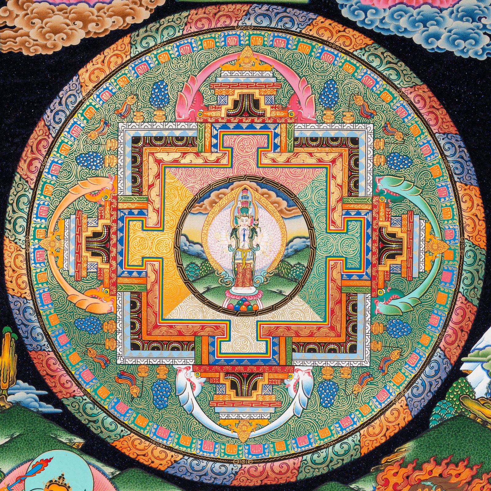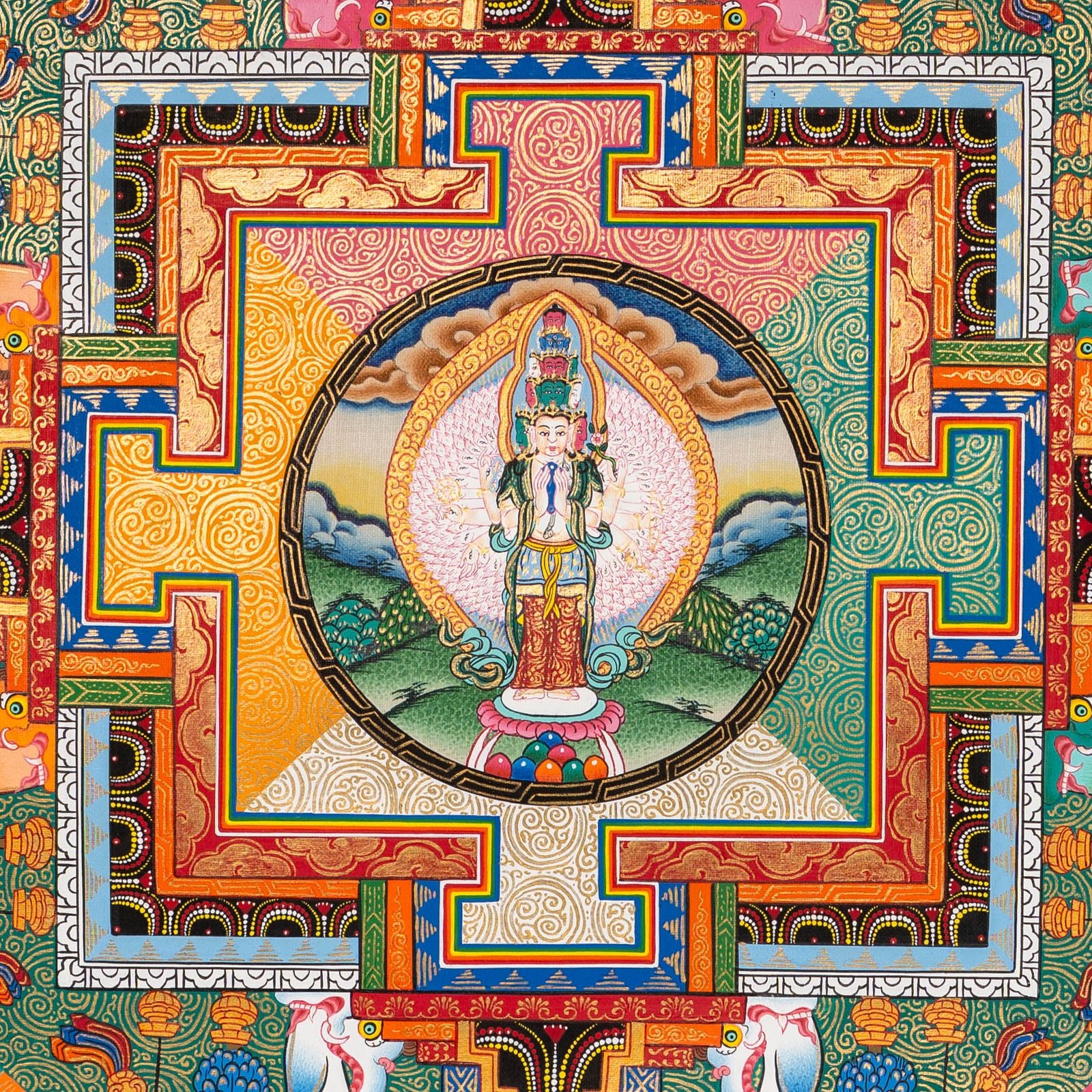 Avalokiteshvara is shown in white at the heart of the mandala, radiating compassion with multiple arms. Surrounding him are five celestial bodhisattvas framed in clouds, while the lower section depicts a serene Himalayan landscape with mountains, rivers, and offerings, connecting the earthly and spiritual realms.