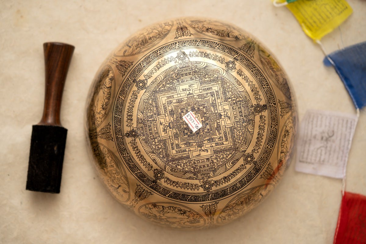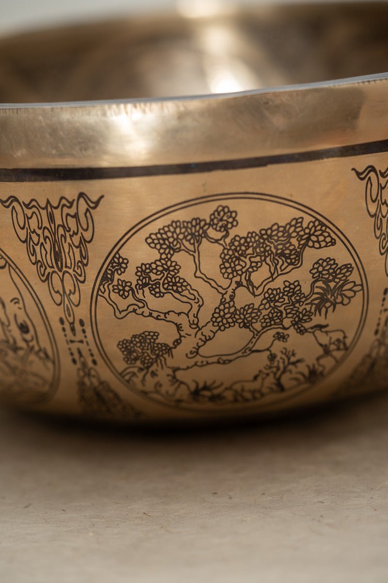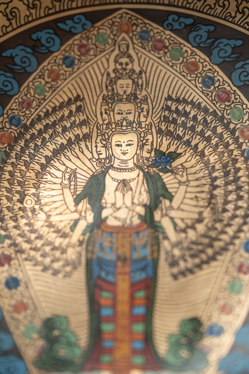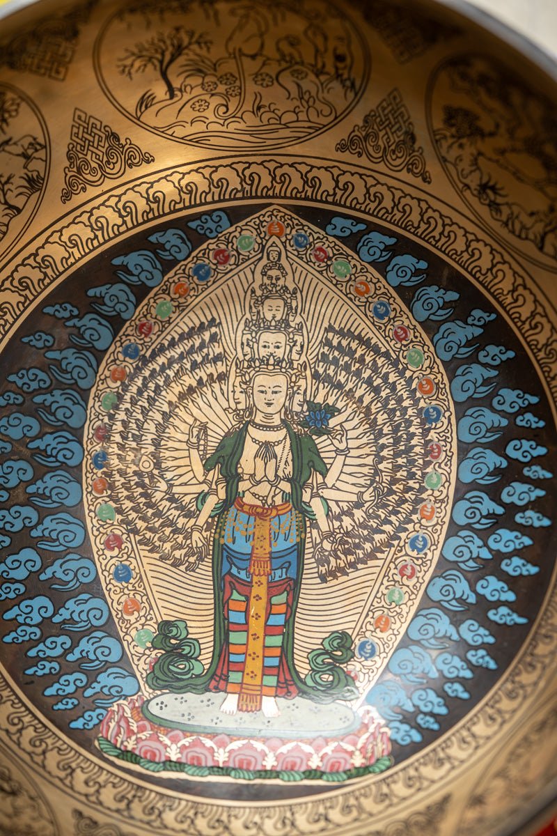 This beautifully hand-etched singing bowl features Avalokiteshvara , the Bodhisattva of Compassion, known for his boundless kindness and desire to end all suffering. Each bowl is painted by skilled Thangka artists in Nepal, combining sacred art with healing sound for a unique spiritual tool.