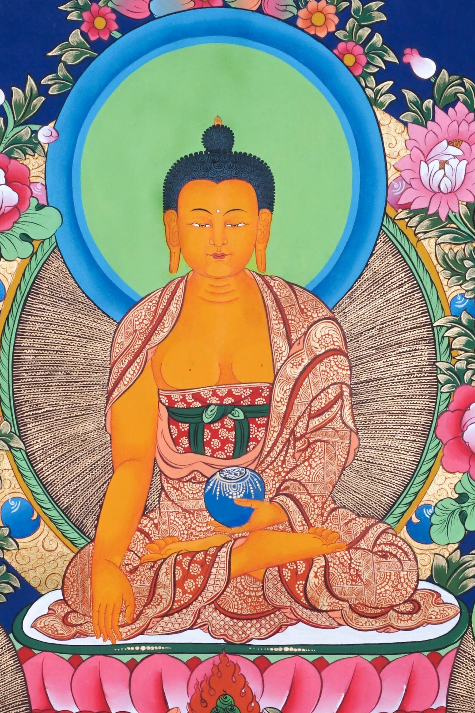 Buddhist Thangka painting depicting Shakyamuni Buddha is perfect for various home decor ideas! All our Thangka paintings and Tibetan mandala. This 100% hand-drawn Thangka painting in Kathmandu Valley, Nepal. Thangka painting can be decorated as an elegant and eccentric wall hanging in your home or office being a centerpiece of attention. It can also be placed on your family altar for meditation purposes as well as spiritual and emotional healing, attracting benevolent energy of the Tibetan Buddhist art. This is one of our best collection high quality Buddha Thangka art.
