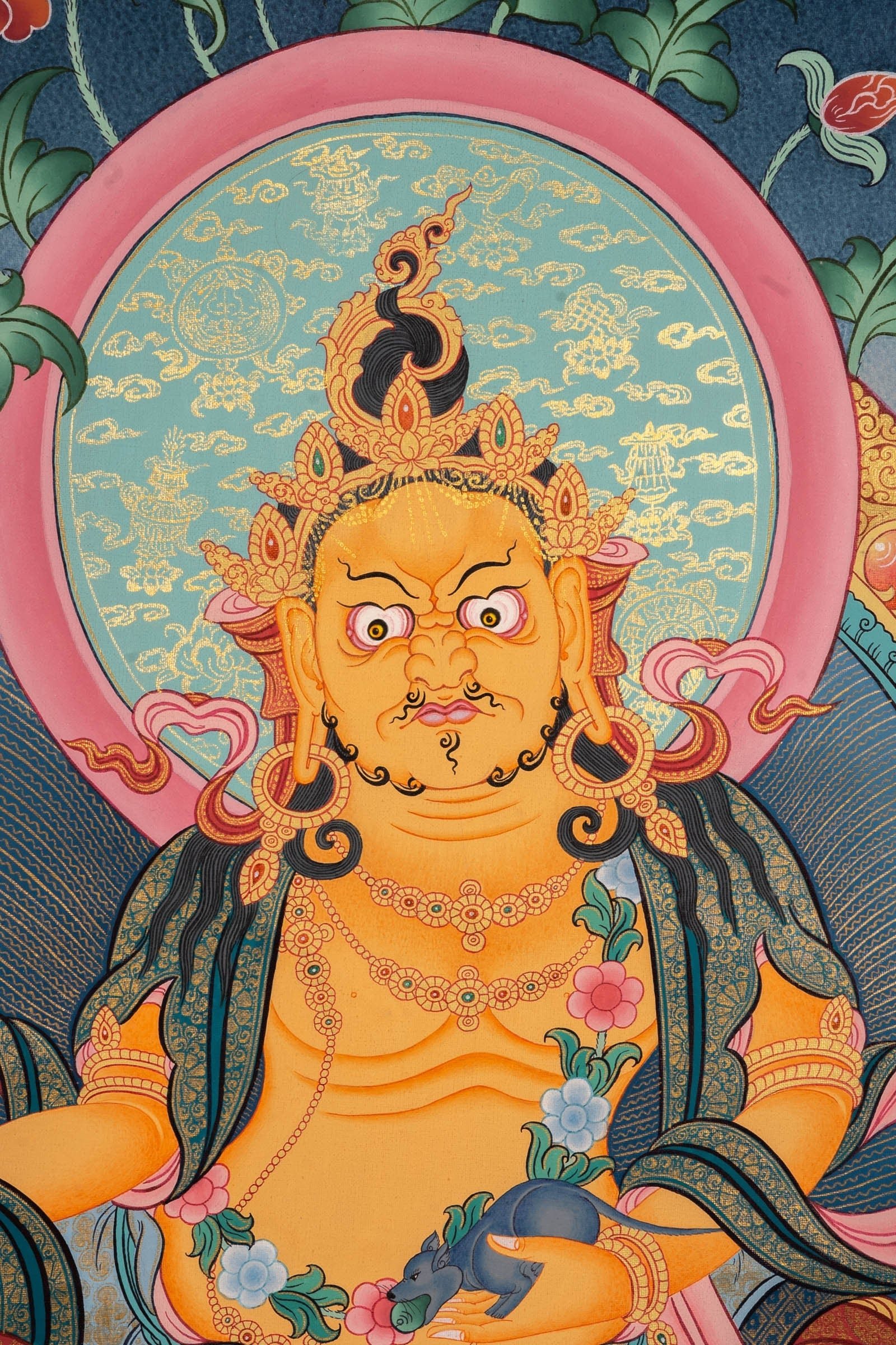 Zambala, Dzambala is a wealth deity whose blessings remove the obstacle of poverty, bringing wealth and abundance to pure Dharma practitioners. As it is difficult to attain spiritual realizations while afflicted by lack of resources, Jambhala generates prosperity so that practitioners have the time, energy, and means to accomplish. According to the Sutras, while Shakyamuni Buddha was teaching one day, demons tried to disturb and confuse the Buddha. Jambhala appeared in front of the Buddha and protected him. Recognizing Jambhala’s courageous action, the Buddha asked Jambhala if he would like to become a Dharma Protector in order to help all sentient beings. Jambhala accepted the Buddha’s offer, and since then he has offered immediate assistance to all who call his name or chant his mantra. His blessings bestow good luck, increase virtues, prolong life, increase intelligence, and provide both material and spiritual benefits.