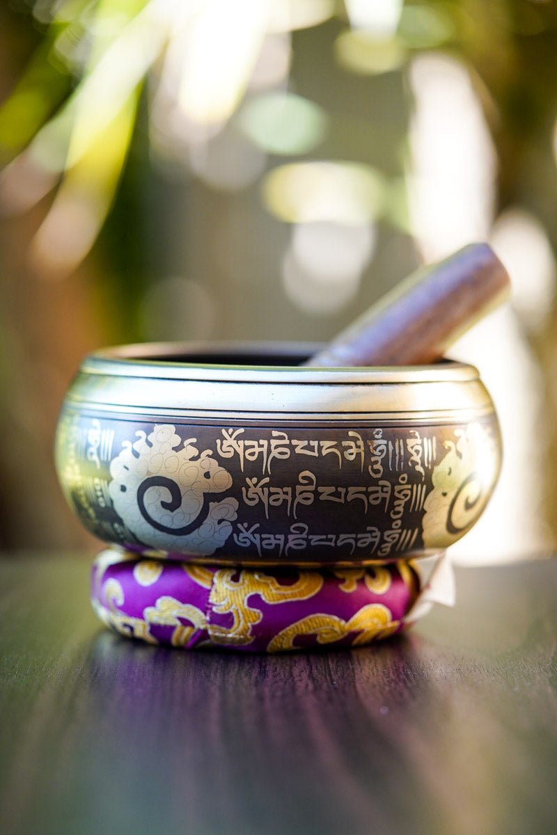 Experience calm and mindfulness with this beautiful Buddha Carved Singing Bowl, handmade in Nepal. The detailed Buddha carving on the bowl symbolizes wisdom, compassion, and inner peace.