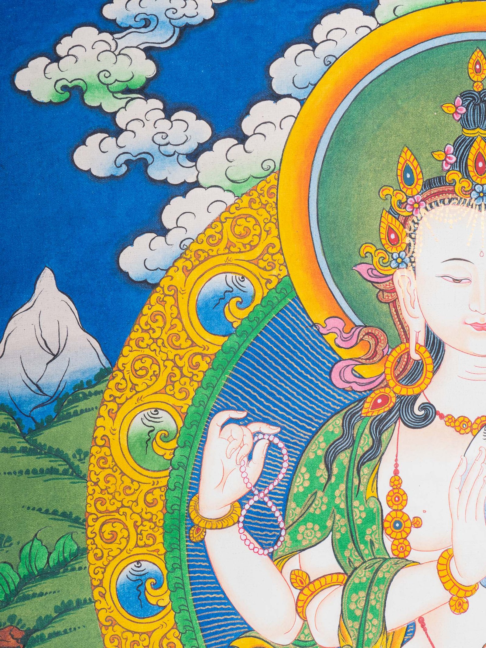 3. Elaborate Background: The background typically features intricate depictions of heavenly scenery and guardian beings. These elements enhance the spiritual and aesthetic charm, providing a divine backdrop for Chenrezig.