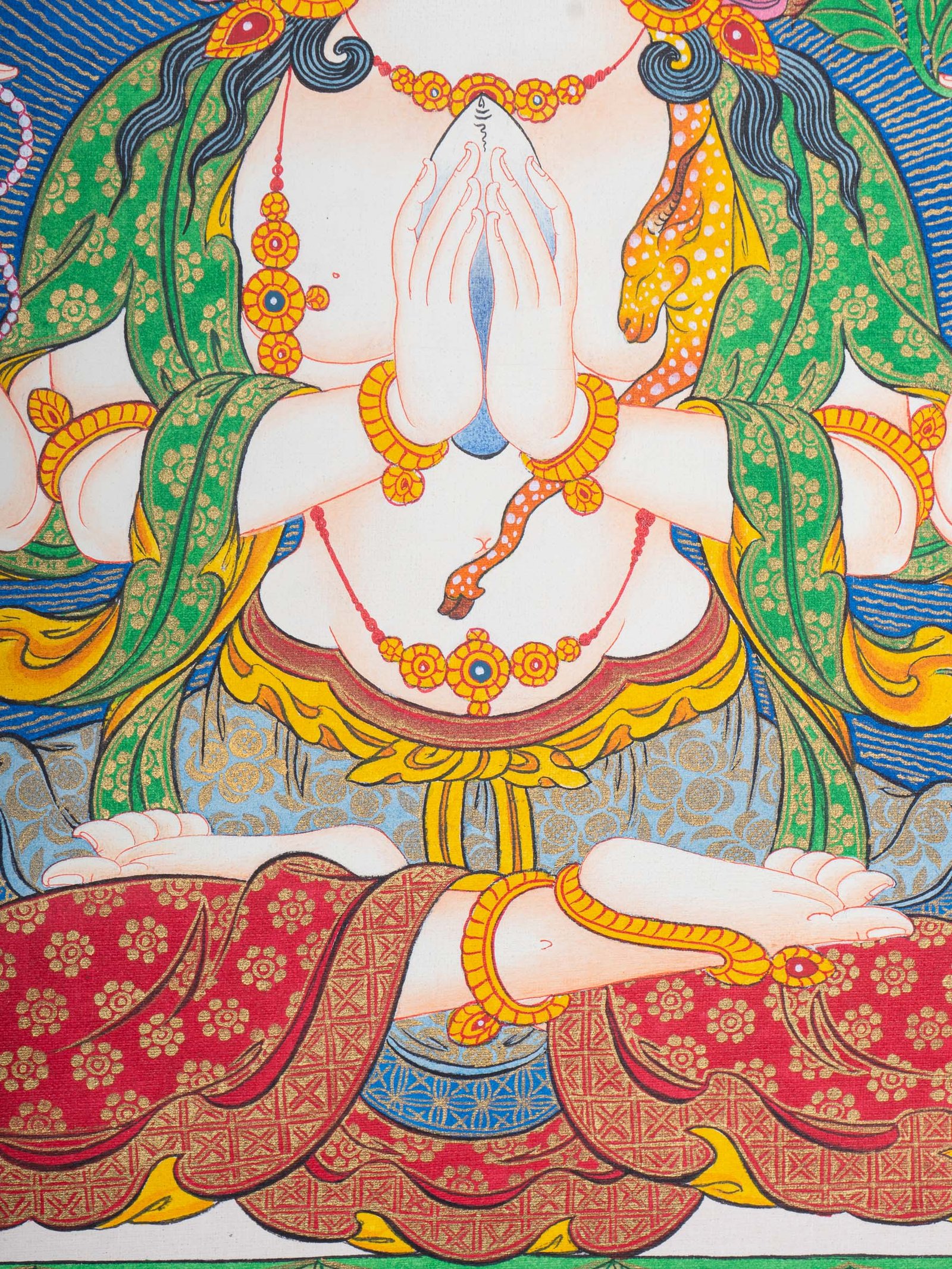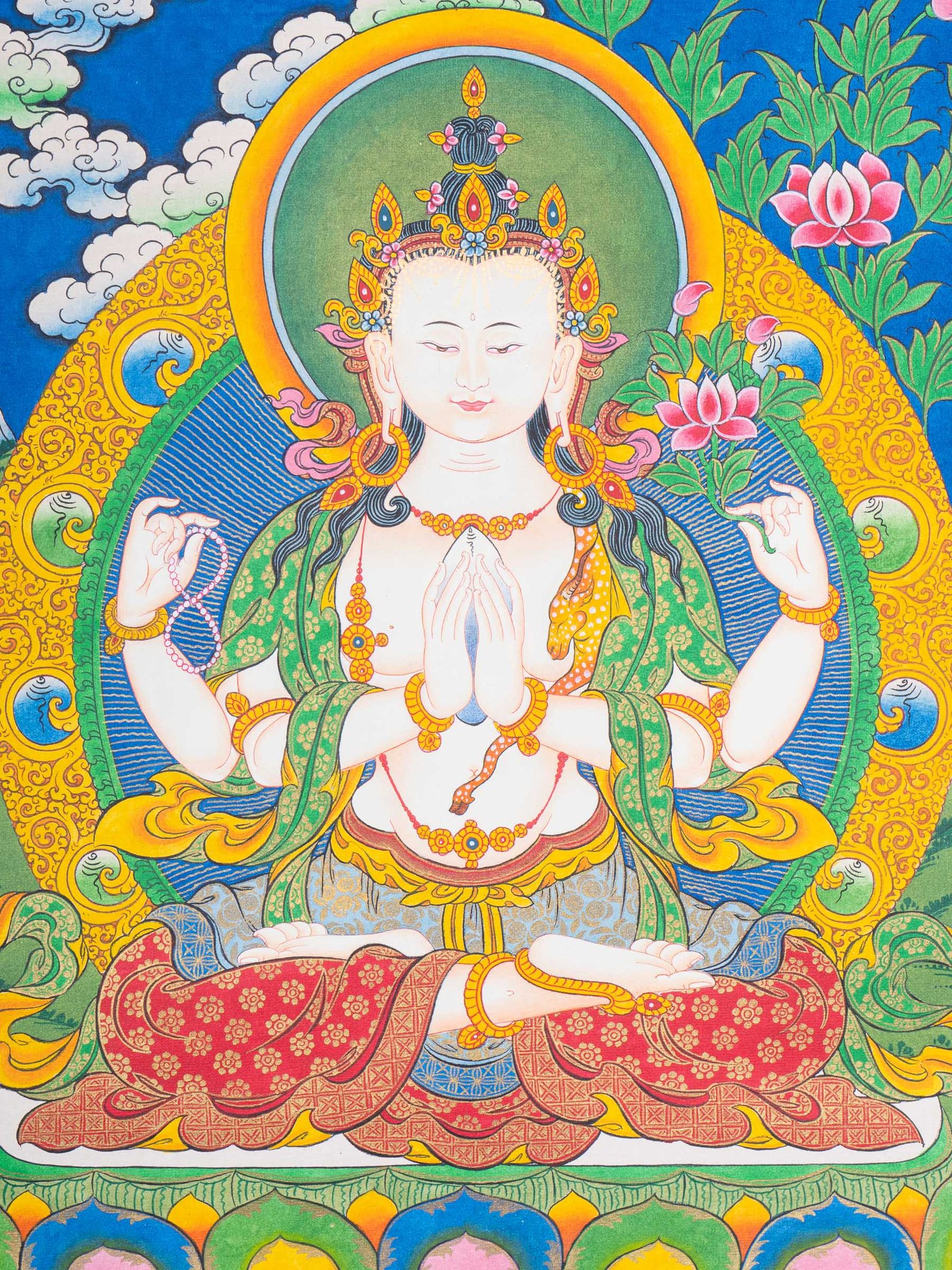 2. Symbolic Elements: Chenrezig holds his hands in a prayer position with a jewel and lotus flower, representing purity and the nature of beings. Additional hands hold a mala and lotus, symbolizing the importance of prayer and enlightenment.