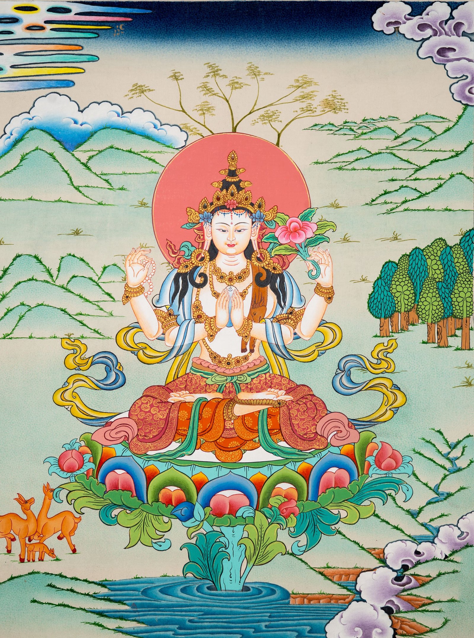 Every element from the four arms to the lotus, mala beads, and wish-fulfilling jewel is carefully rendered to convey spiritual meaning and devotion. Surrounded by natural landscapes and divine motifs, this Thangka enhances sacred spaces while guiding mantra practice, meditation, and the cultivation of compassion in daily life.