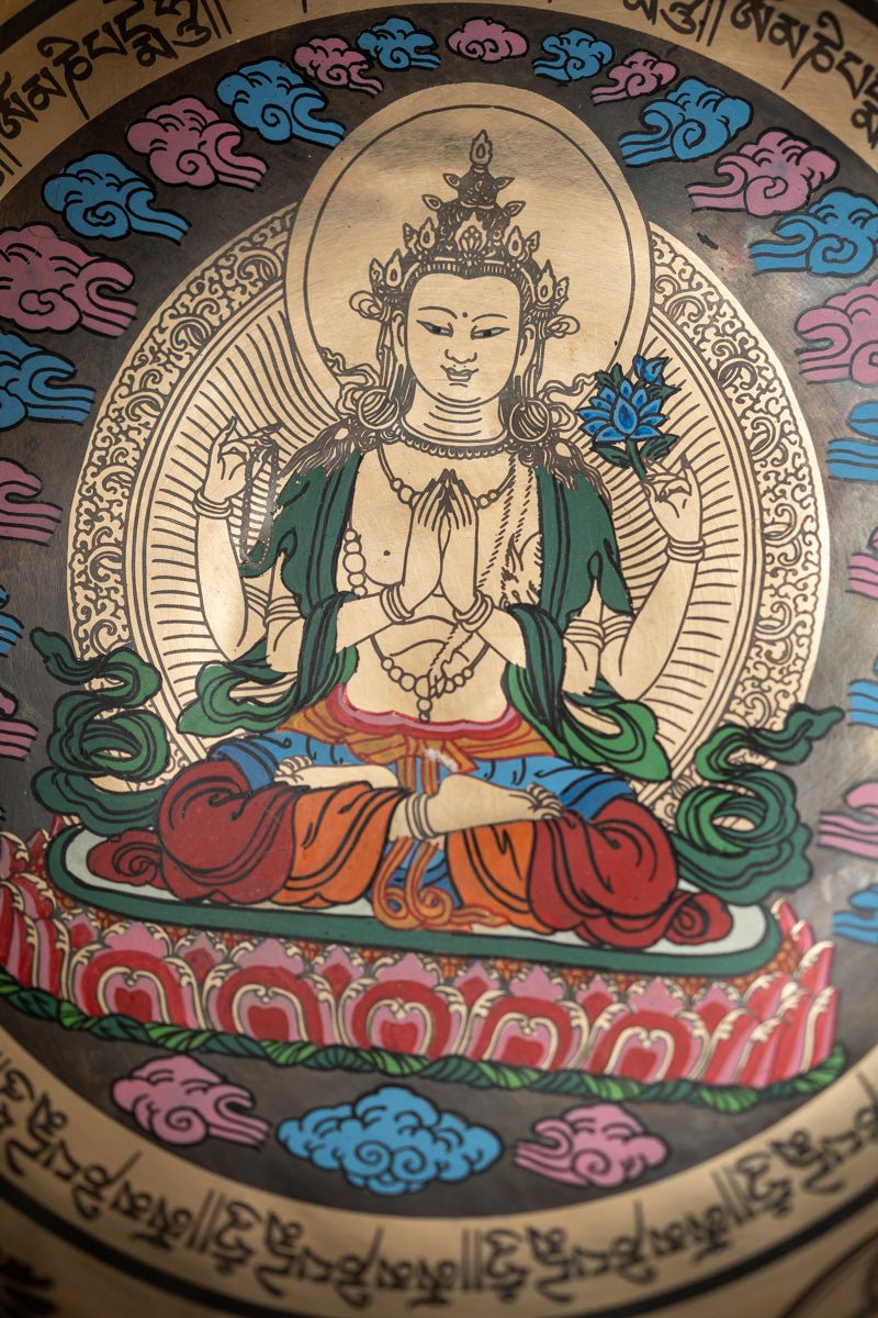 This beautifully hand-etched singing bowl features Four-Armed Chenrezig, the Tibetan embodiment of Avalokiteshvara , the Bodhisattva of Infinite Compassion . His four arms represent the four immeasurable states: compassion, love, joy, and equanimity . Chenrezig is honored as the one who hears the cries of all beings, offering healing and kindness through his enlightened presence.
