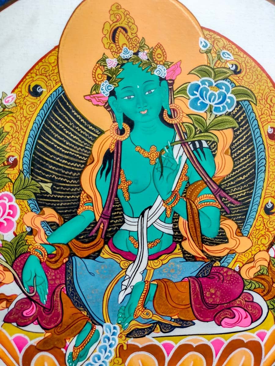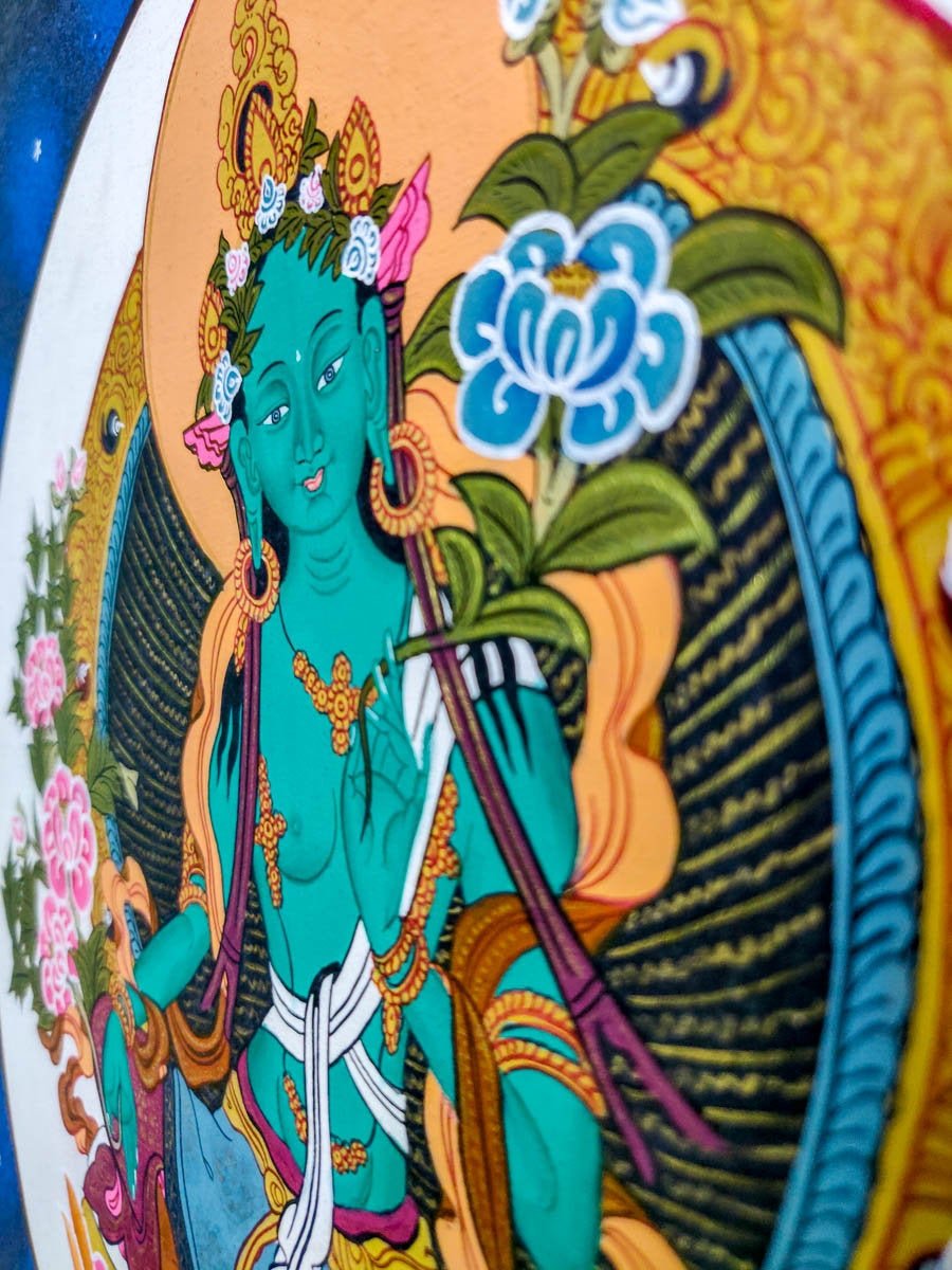 Green Tara is adorned in silken garments and jeweled ornaments. The main difference on the iconography between the green Tara and the white Tara is the position of the legs. Green Tara sits in a posture of ease, with one leg drawn towards her and the other resting on a lotus bud that springs from the pedestal. Her hands are in the mudra of perfect generosity, holding the stems of blue lotus showing a peaceful and smiling expression.