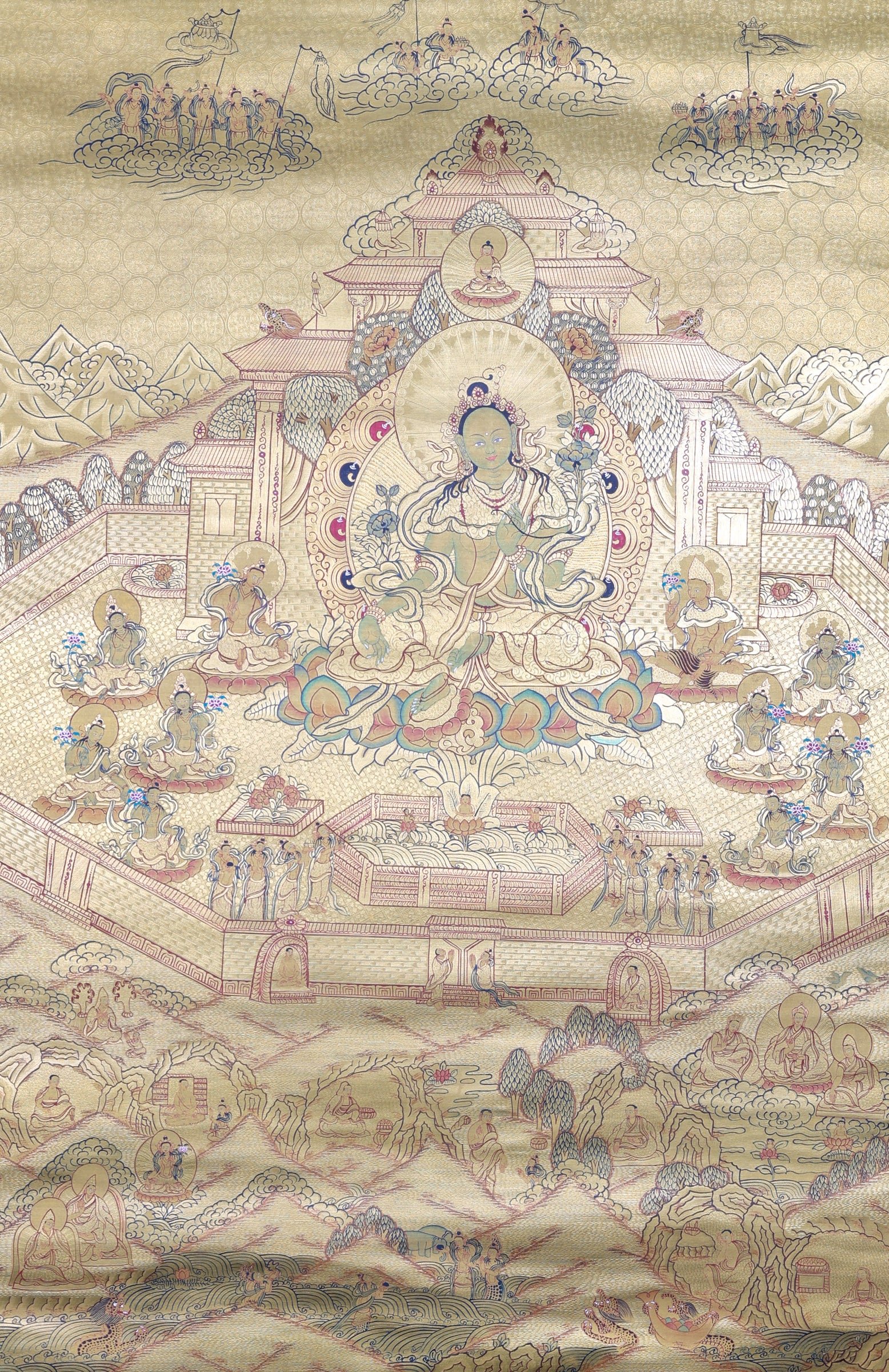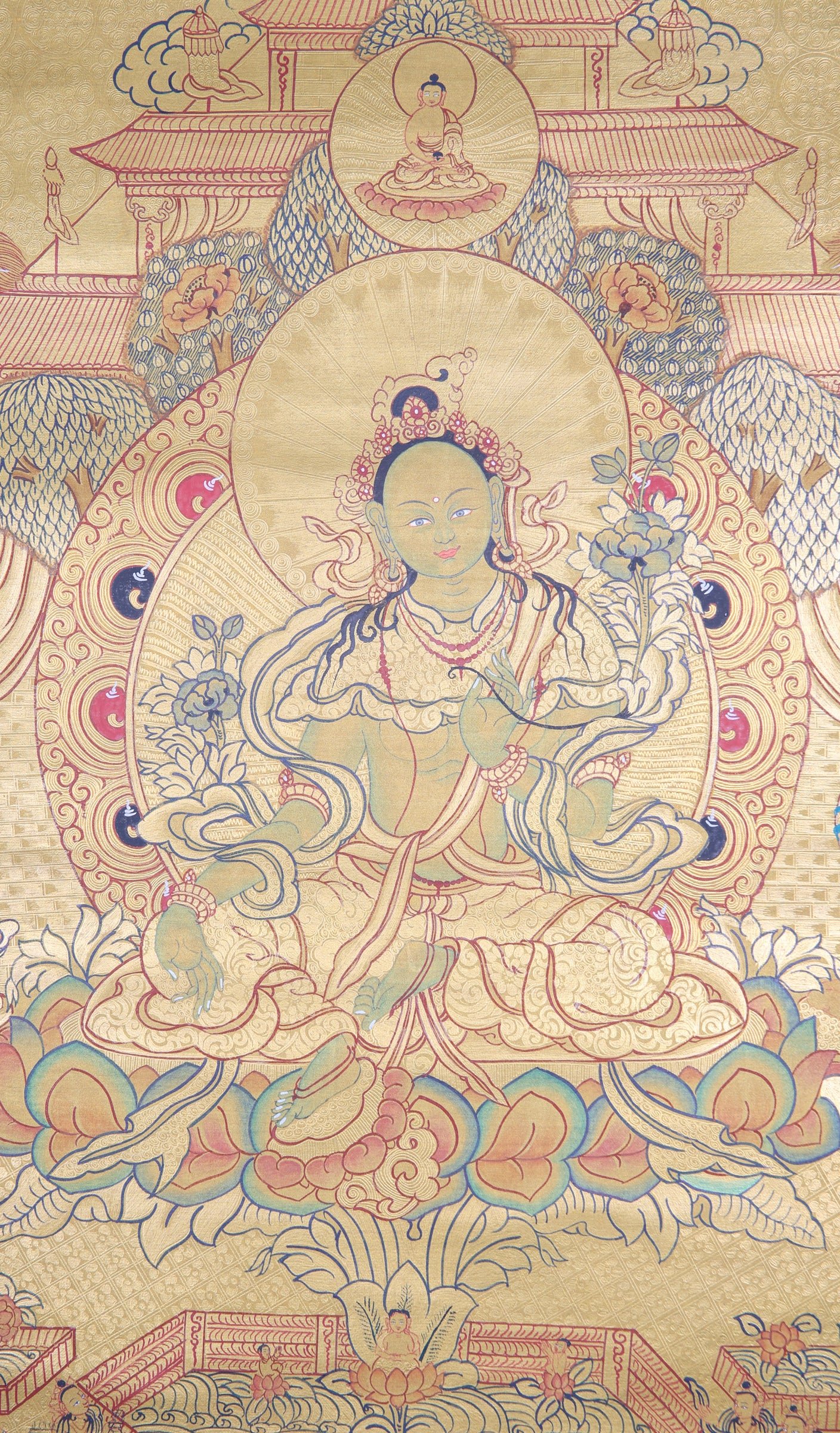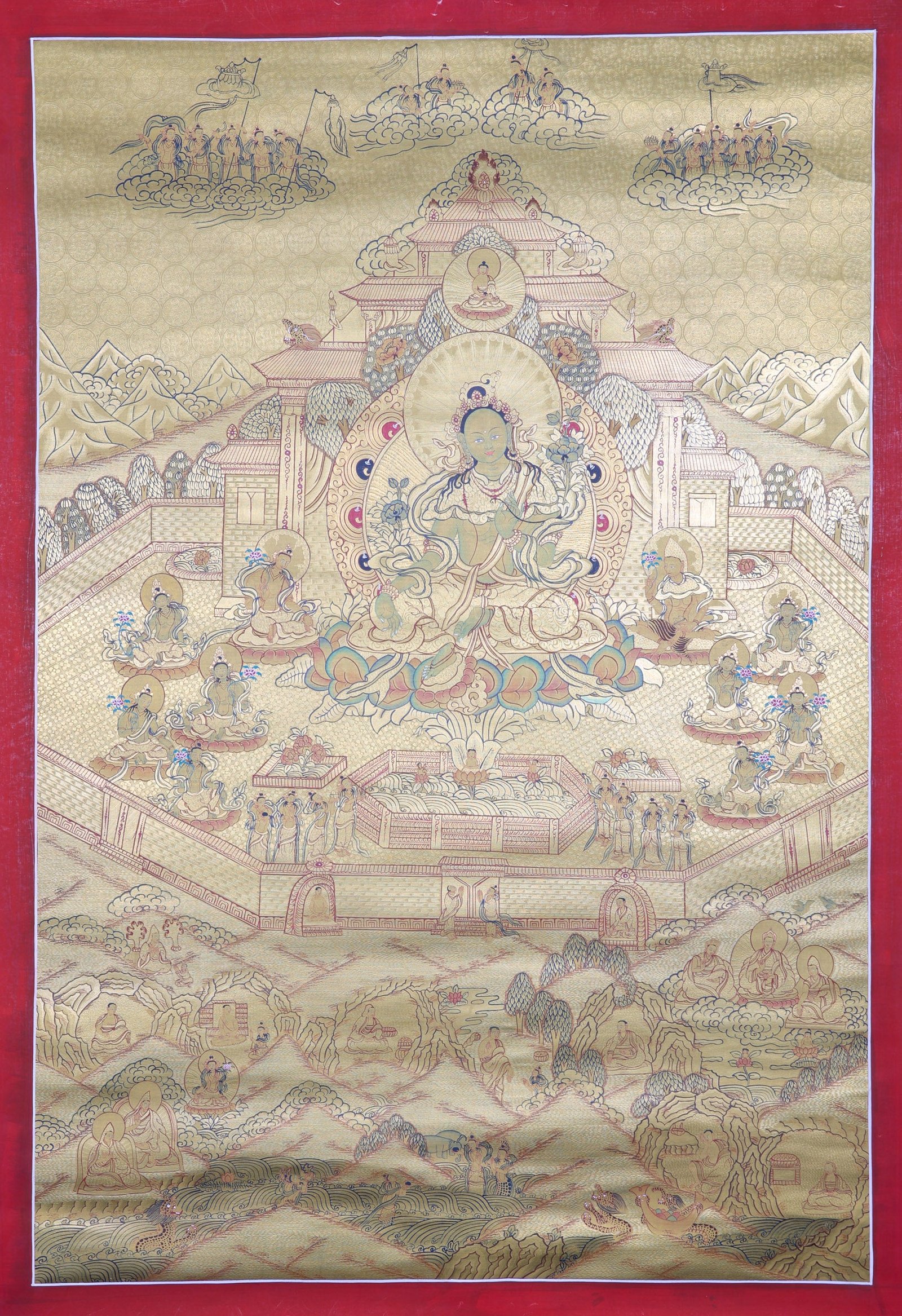 The Green Tara Temple thangka painting is an object of spiritual practices in Tibetan Buddhism, as well as a decor piece that adds visual appeal to any home. Representing Green Tara within a temple, this painting provides an inspiring focal point to evoke feelings of protection, kindness, and fast decision-making. It is also frequently used for rituals, meditations, and prayers.