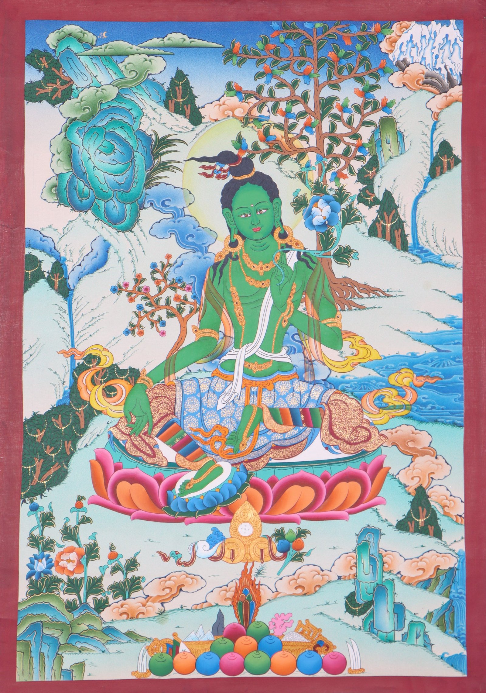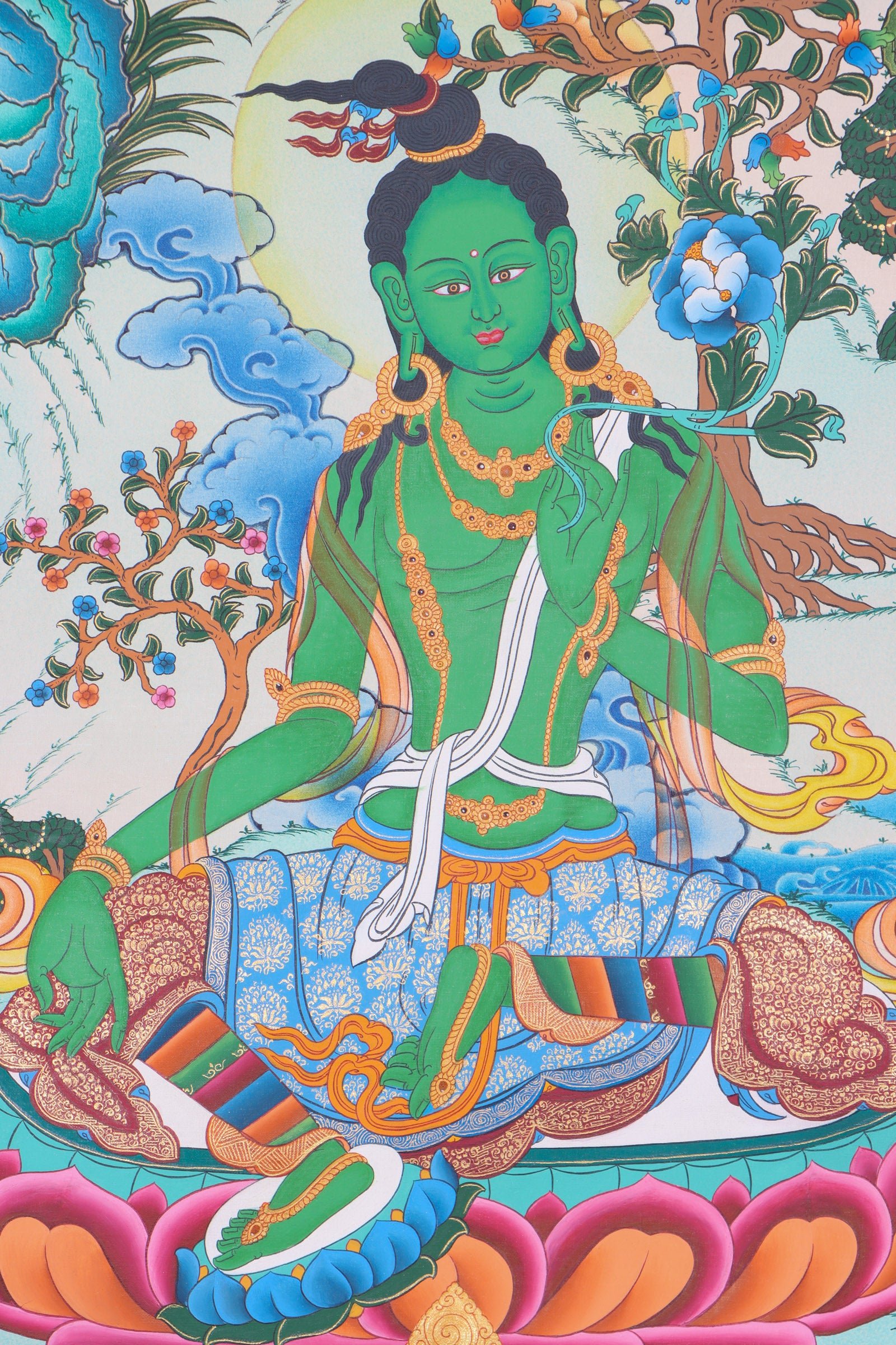 Green Tara Thangka is a hand-painted Tibetan Buddhist painting faithfully depicting gods, Buddhas, mandalas, or scriptures of Buddhism on silk or canvas. Crafted with precision, this piece of traditional artwork is carefully produced with delicate tools and techniques to bring an inner harmony and serenity to any home.