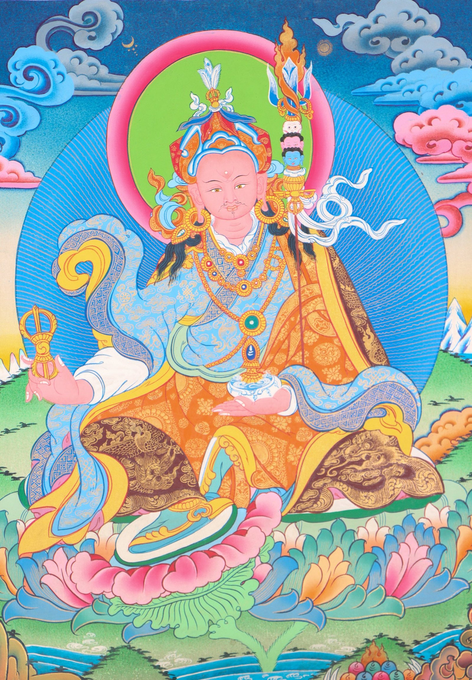 Guru Padmasambhava, often referred to as Guru Rinpoche, is one of the most venerable figures in Tibetan Buddhism. Thangka paintings are a traditional art form used to honor Guru Padmasambhava, depicting him in a mature state while wearing luxurious robes and seated upon a lotus throne. He is often seen holding a vajra (thunderbolt) and a skull cup full of elixir, both symbols of the Tantric Buddhist path’s union of skillful methods and wisdom. The intricate details and vibrant colors of the thangka painting make this a truly beautiful way to honor Guru Padmasambhava. It is a meaningful and sacred symbol for practitioners of Tibetan Buddhism.