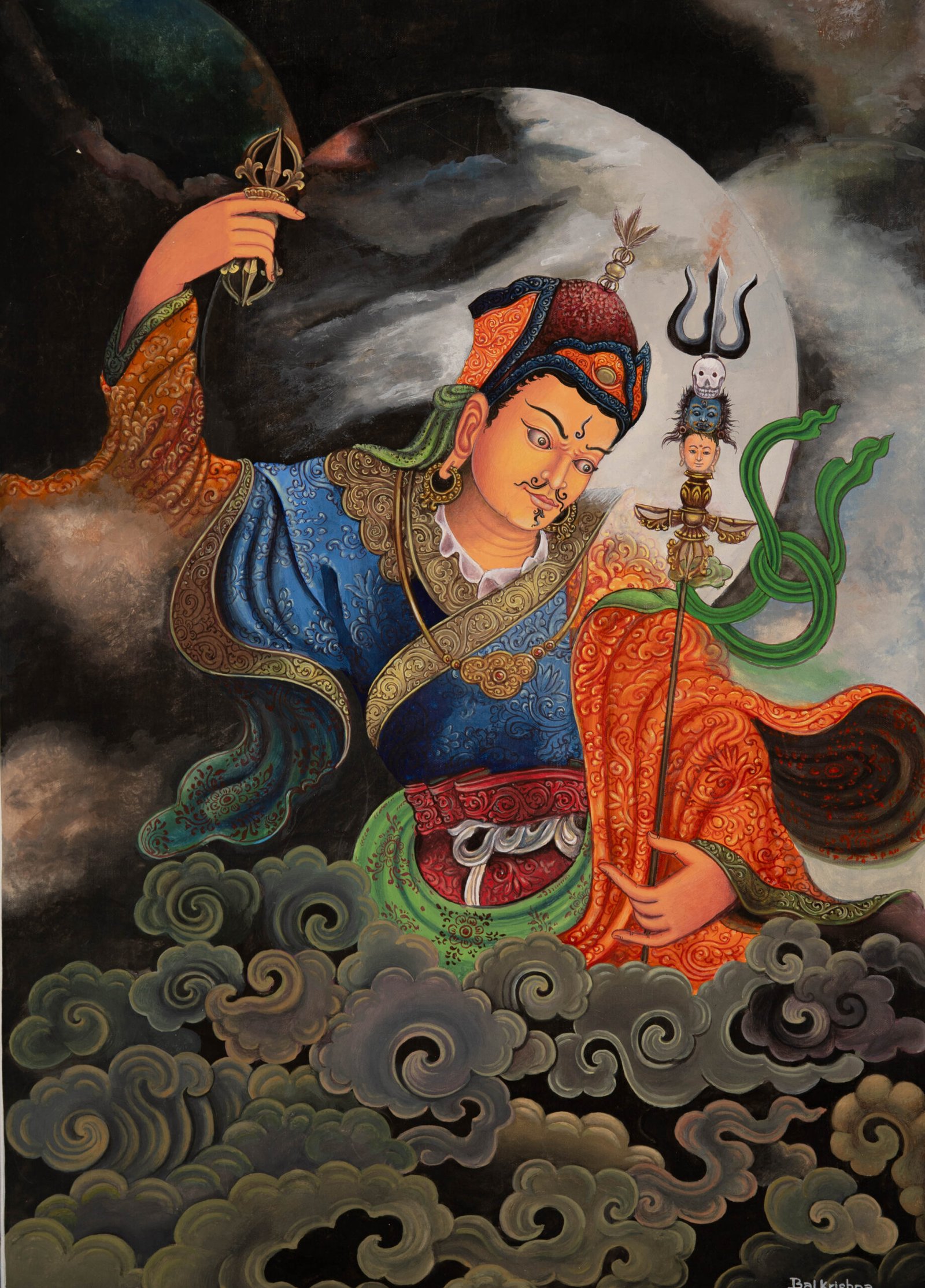 Created by a skilled Newar artisan using natural pigments, every detail—from the vajra and trident-topped staff to the mystical skull crown and atmospheric background—reflects devotion and mastery. Perfect for meditation, altar display, or as a collector’s piece, this Thangka serves as both a sacred tool and a timeless work of Himalayan art.