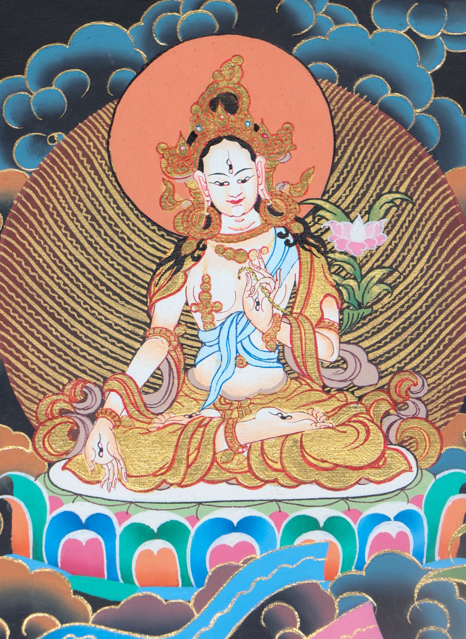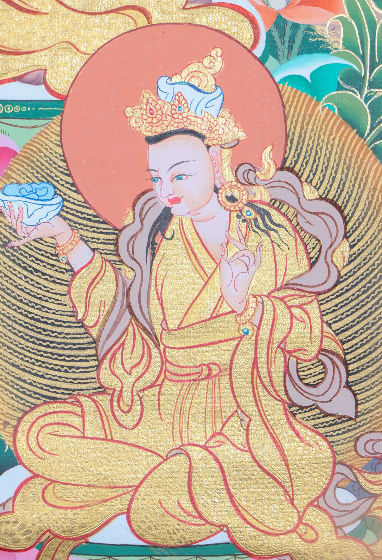 A thangka is a Tibetan painting that is traditionally used as a support for one’s meditation practice. The imagery depicted in Tibetan paintings provides a guide for the elaborate visualizations that one does in Tibetan Buddhist practice. In Tibetan homes and monasteries, thangkas are considered sacred objects and are often placed above shrines.
