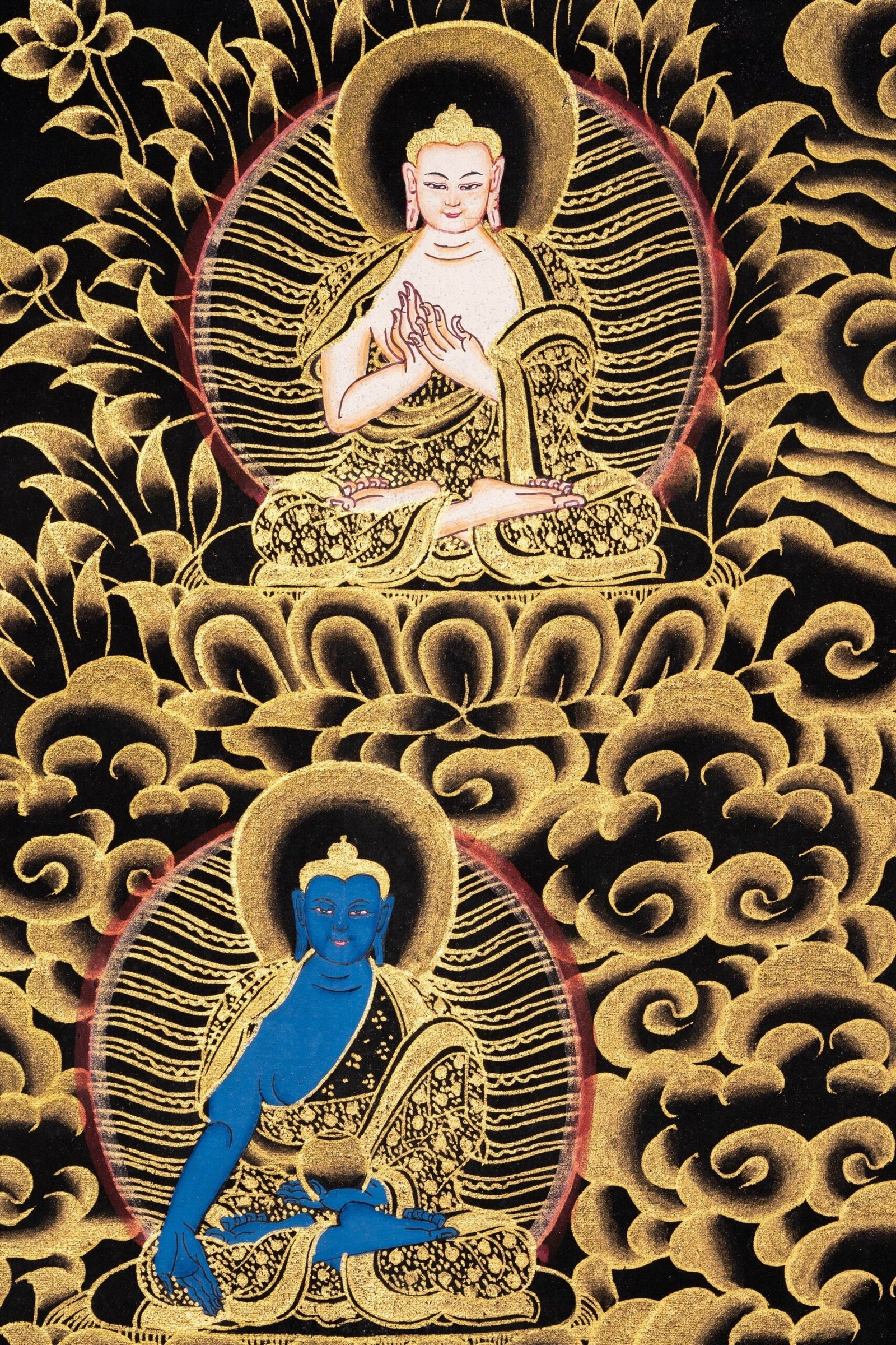 A thangka is a Tibetan painting that is traditionally used as a support for one’s meditation practice. The imagery depicted in Tibetan paintings provides a guide for the elaborate visualizations that one does in Tibetan Buddhist practice. In Tibetan homes and monasteries, thangkas are considered sacred objects and are often placed above shrines.