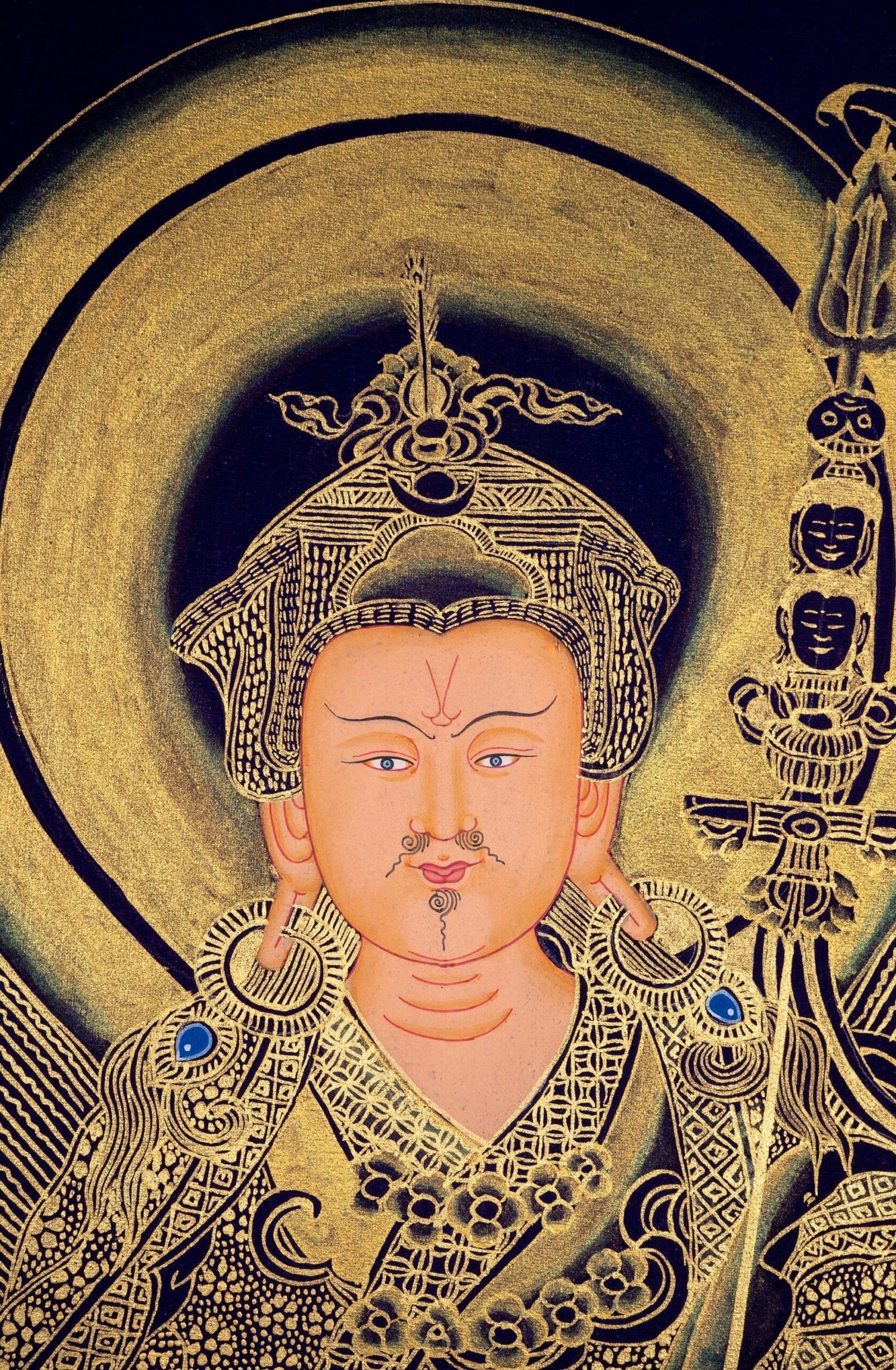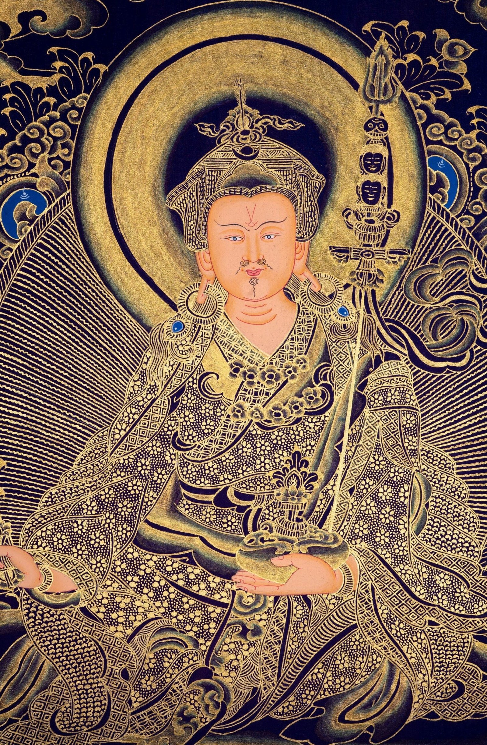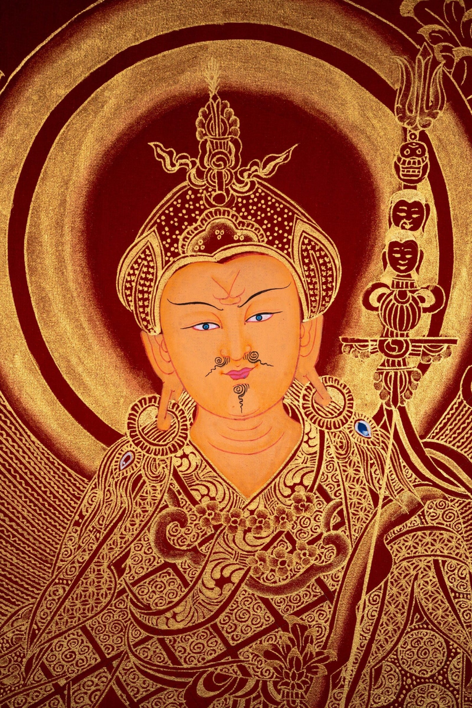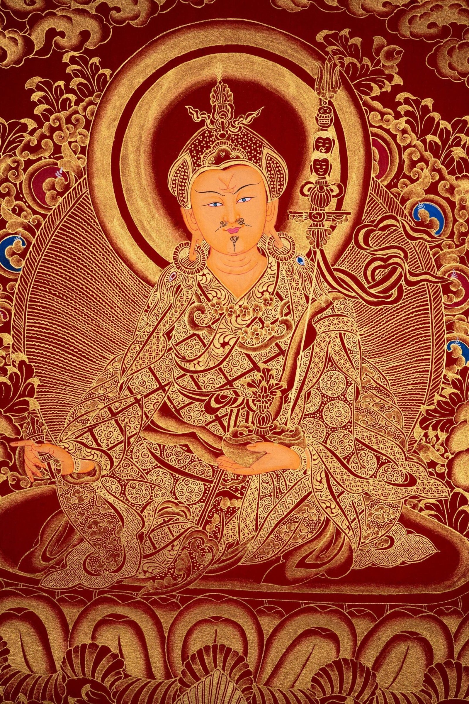 In Tibetan, Guru Padmasambhava is generally referred to as Guru Rinpoche, which means “precious master. Guru Rinpoche is a totally enlightened being, a fully awakened one, a buddha. He did not become enlightened gradually, or start practicing the teachings of Buddha Shakyamuni and eventually achieve enlightenment. Guru Rinpoche incarnated as a fully enlightened being. Through his form, primordial wisdom manifests in the world to benefit all sentient beings. Guru Rinpoche is the archetypal perfect teacher: a role model. In him are to be found all the skills required to guide others. First and foremost, he attains mastery himself and only teaches others that which is perfectly assimilated in his own being, through having gone to the correct source, practised the teachings assiduously, become a worthy lineage-holder and been empowered as a guru. He embodies all the personal qualities of kindness, patience, tolerance as well as the more dynamic ones of knowing when to show force and wrath in order to help others break through emotional or meditation barriers.