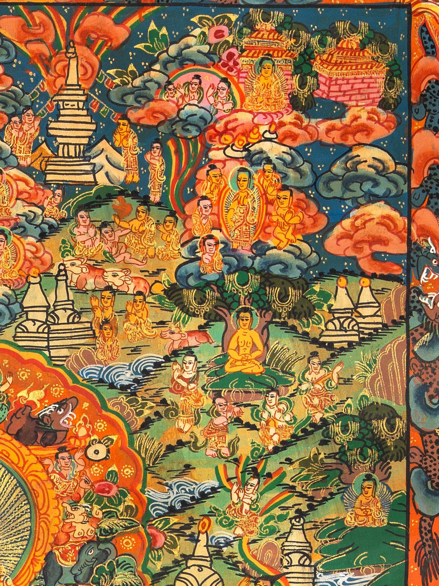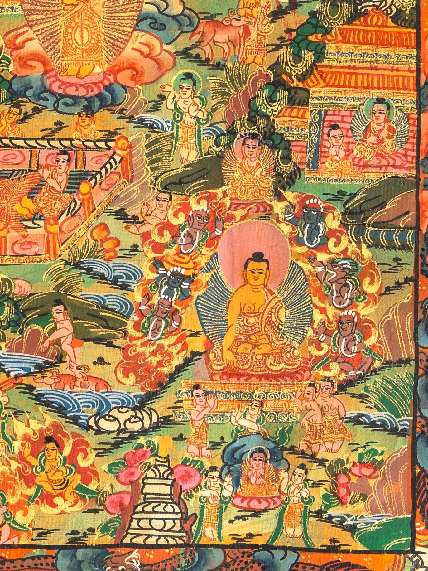 This Buddha Life Thangka painting beautifully portrays the sacred journey of Siddhartha Gautama, the historical Buddha, from birth to enlightenment. Hand-painted in the traditional Tibetan style using vibrant natural pigments, it highlights key events such as his birth in Lumbini, renunciation of royal life, meditation under the Bodhi tree, and his enlightenment followed by teaching the Dharma. Each scene is rich in symbolic meaning, offering both spiritual guidance and artistic beauty, making it perfect for meditation spaces, personal altars, or Dharma centers.