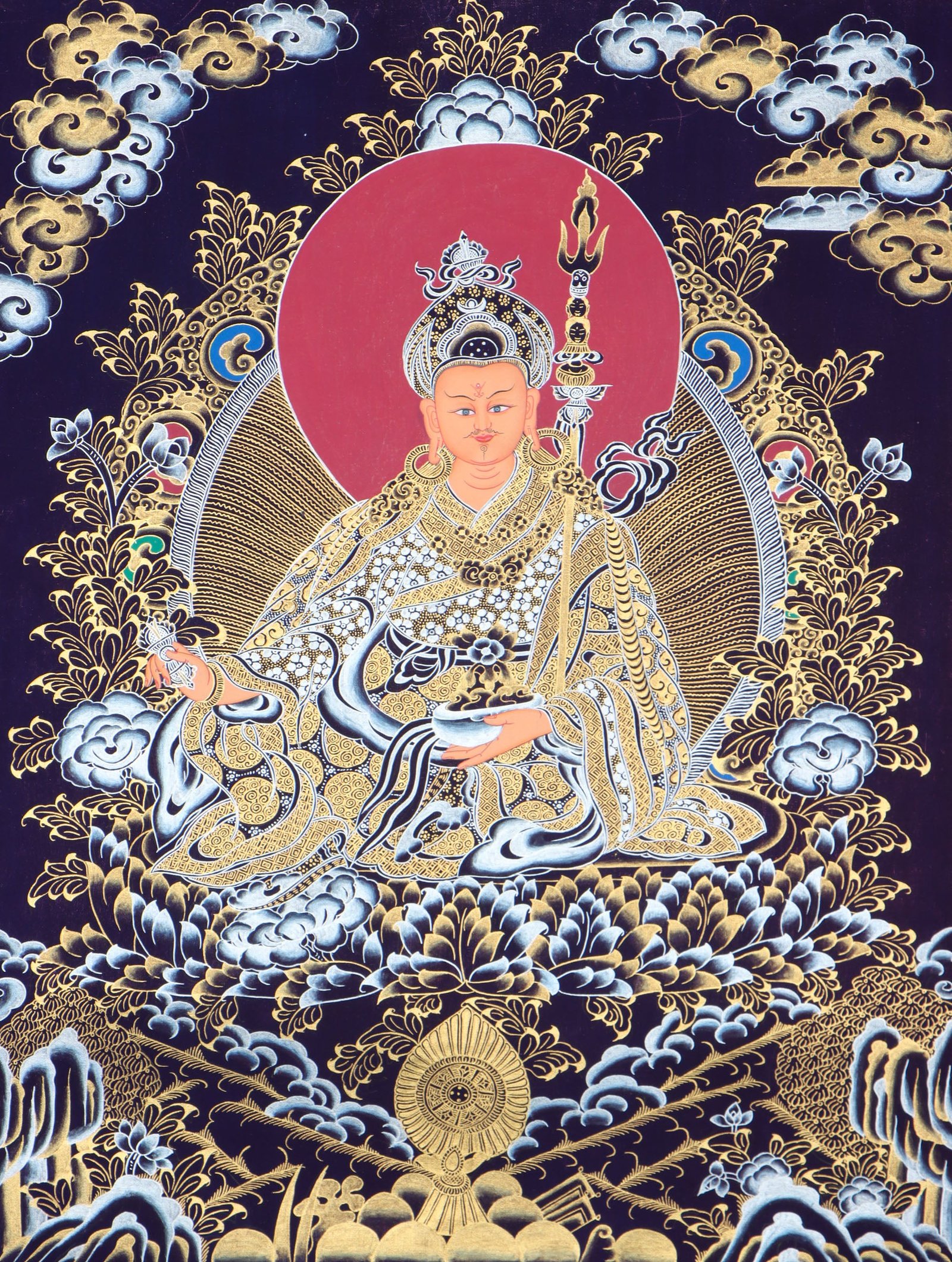 Guru Rinpoche Thangka represent the figure in his characteristic pose, seated on a blooming lotus throne. He is depicted serenely with a gracious expression, wearing detailed finery and adorned with brilliant jewellery. Commonly, he is portrayed with his right hand in the ‘abhaya mudra’ – a gesture of safeguard – and his left holding a vajra, symbolizing potency.