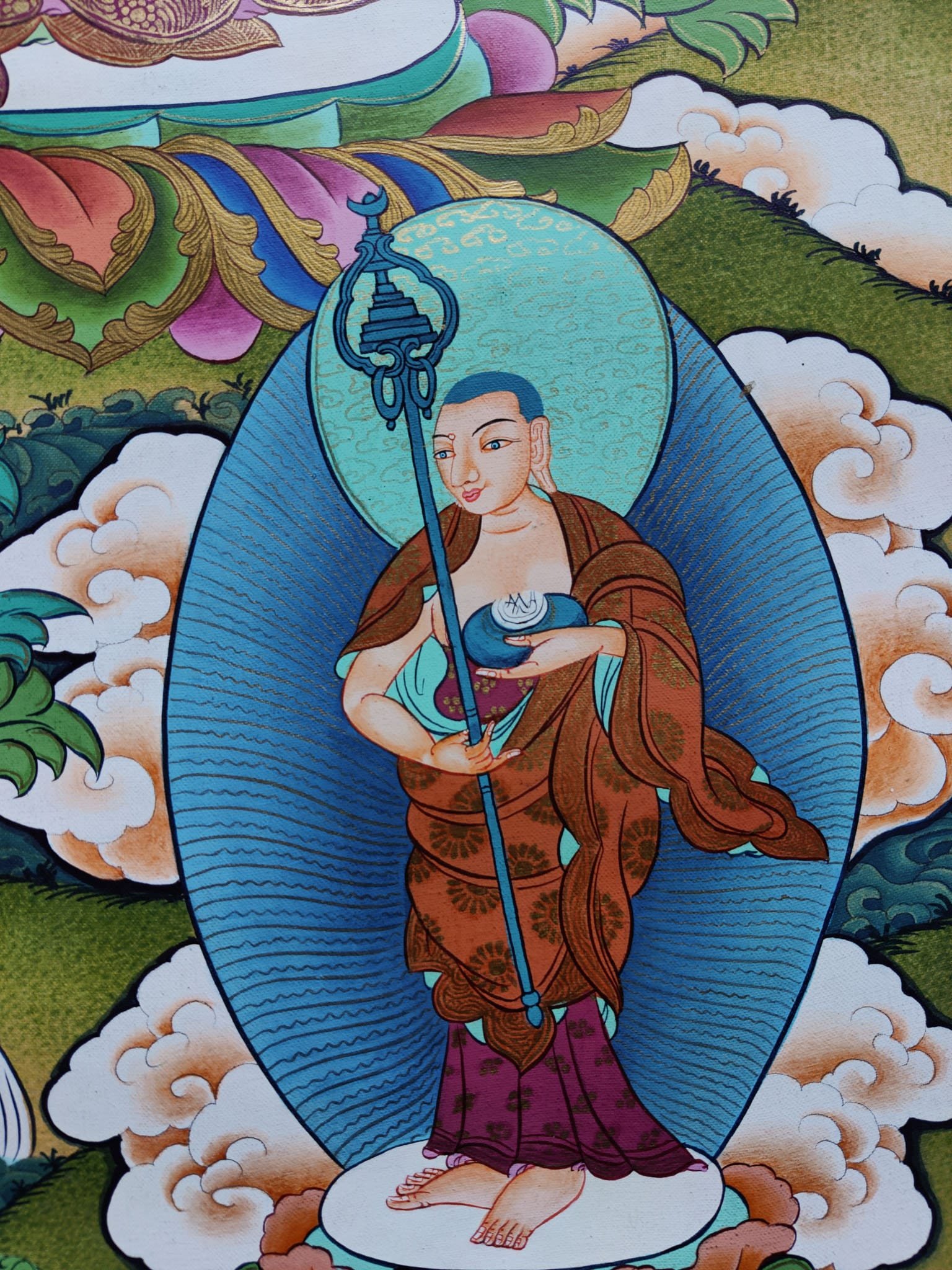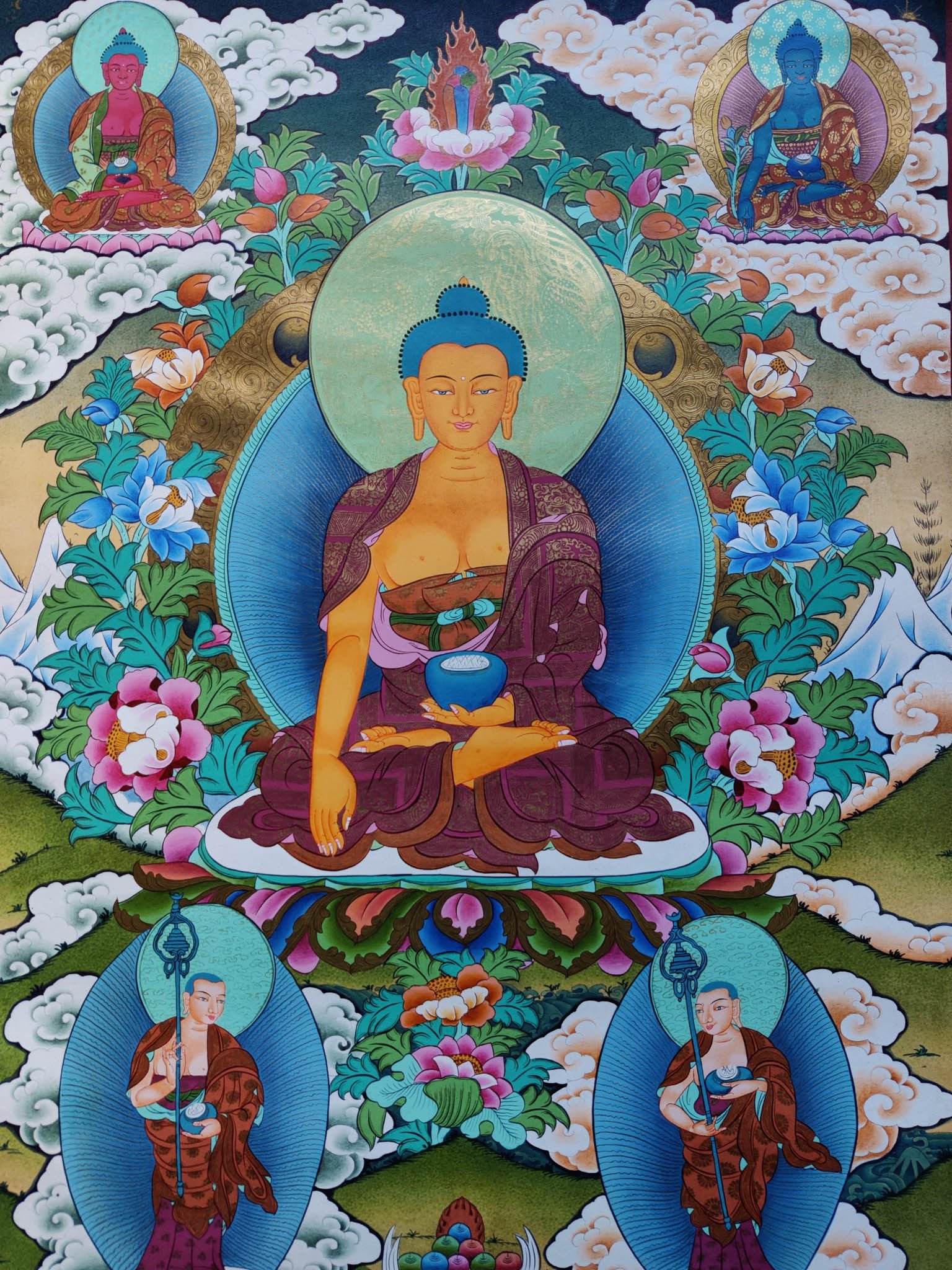 Buddhist Thangka painting depicting Shakyamuni Buddha is perfect for various home decor ideas! All our Thangka paintings and Tibetan mandala. This 100% hand-drawn Thangka painting in Kathmandu Valley, Nepal. Thangka painting can be decorated as an elegant and eccentric wall hanging in your home or office being a centerpiece of attention. It can also be placed on your family altar for meditation purposes as well as spiritual and emotional healing, attracting benevolent energy of the Tibetan Buddhist art. This is one of our best collection high quality Buddha Thangka art.