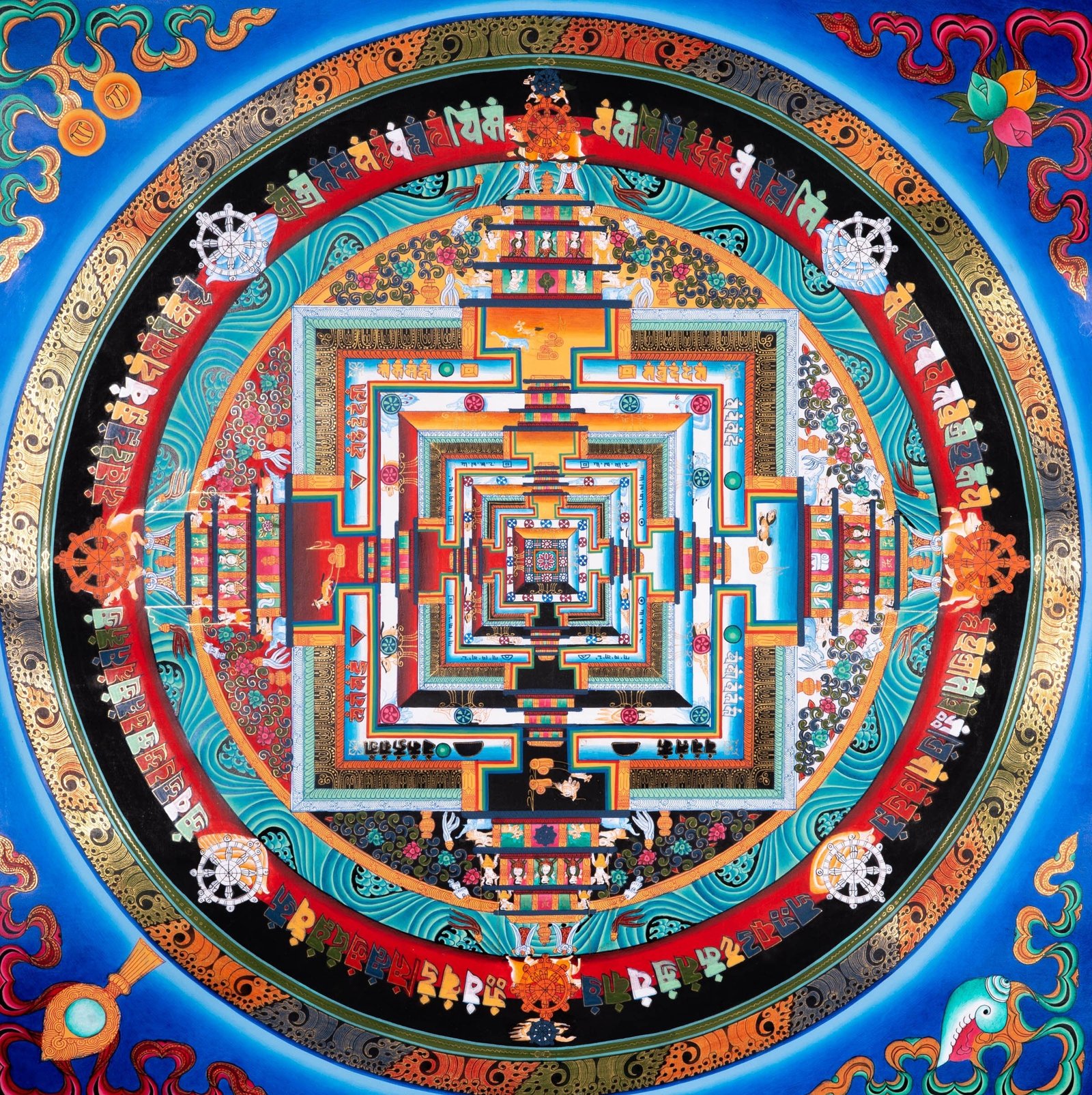 Thangka Painting of a Kalchakra Mandala for Spirituality, Meditation or for your home and family. All Thangka Paintingsat Lucky Thanka is genuine hand-painted in Nepal by highly skilled lama artists. Painted on cotton canvas using natural stone color and other materials like gold, silver other semi-precious minerals. This art can also be a very beautiful wall hanging decoration idea for your home and office.