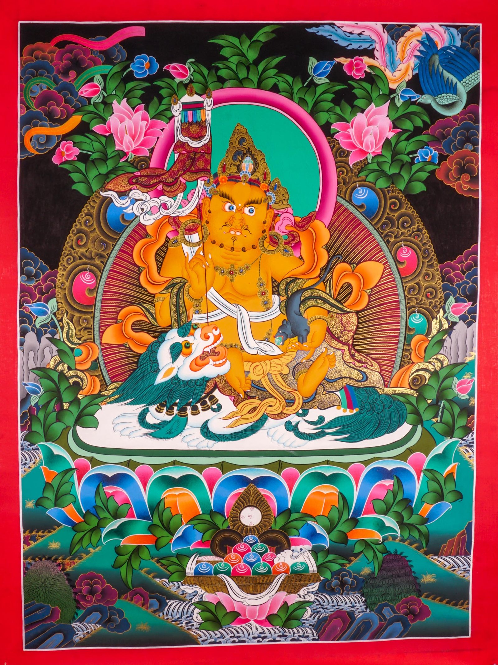 Tibetan Painting depicting Zambala in a Thangka that is traditionally used as a support for one’s meditation practice.A thangka is a Tibetan painting that is traditionally used as a support for one’s meditation practice. The imagery depicted in Tibetan paintings provides a guide for the elaborate visualisations that one does in Tibetan Buddhist practice. In Tibetan homes and monasteries, thangkas are considered sacred objects and are often placed above shrines.