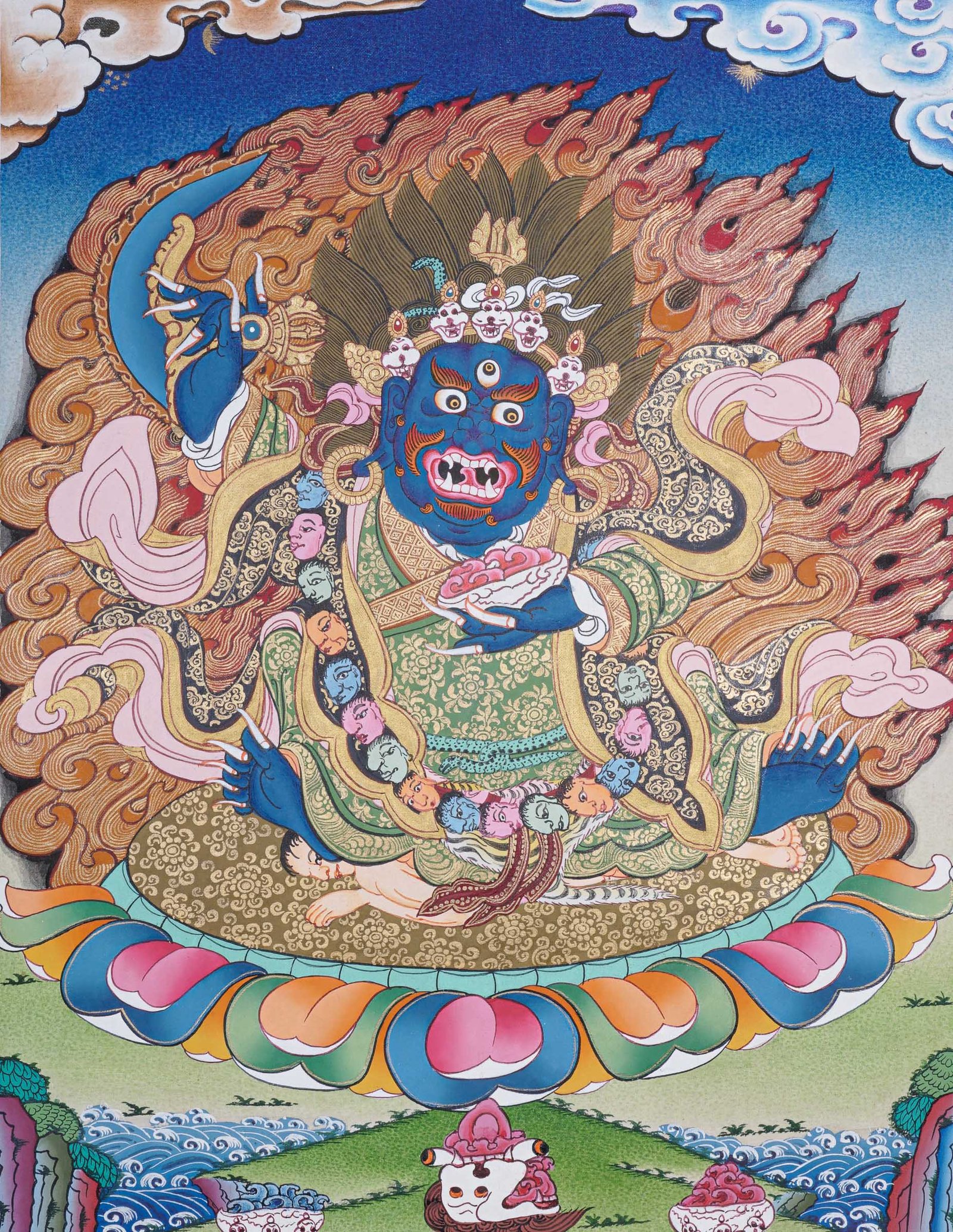 - Attributes: Mahakala is portrayed with various adornments such as earrings, necklaces, bracelets, and garlands of severed heads, representing transformation and wrathful compassion.