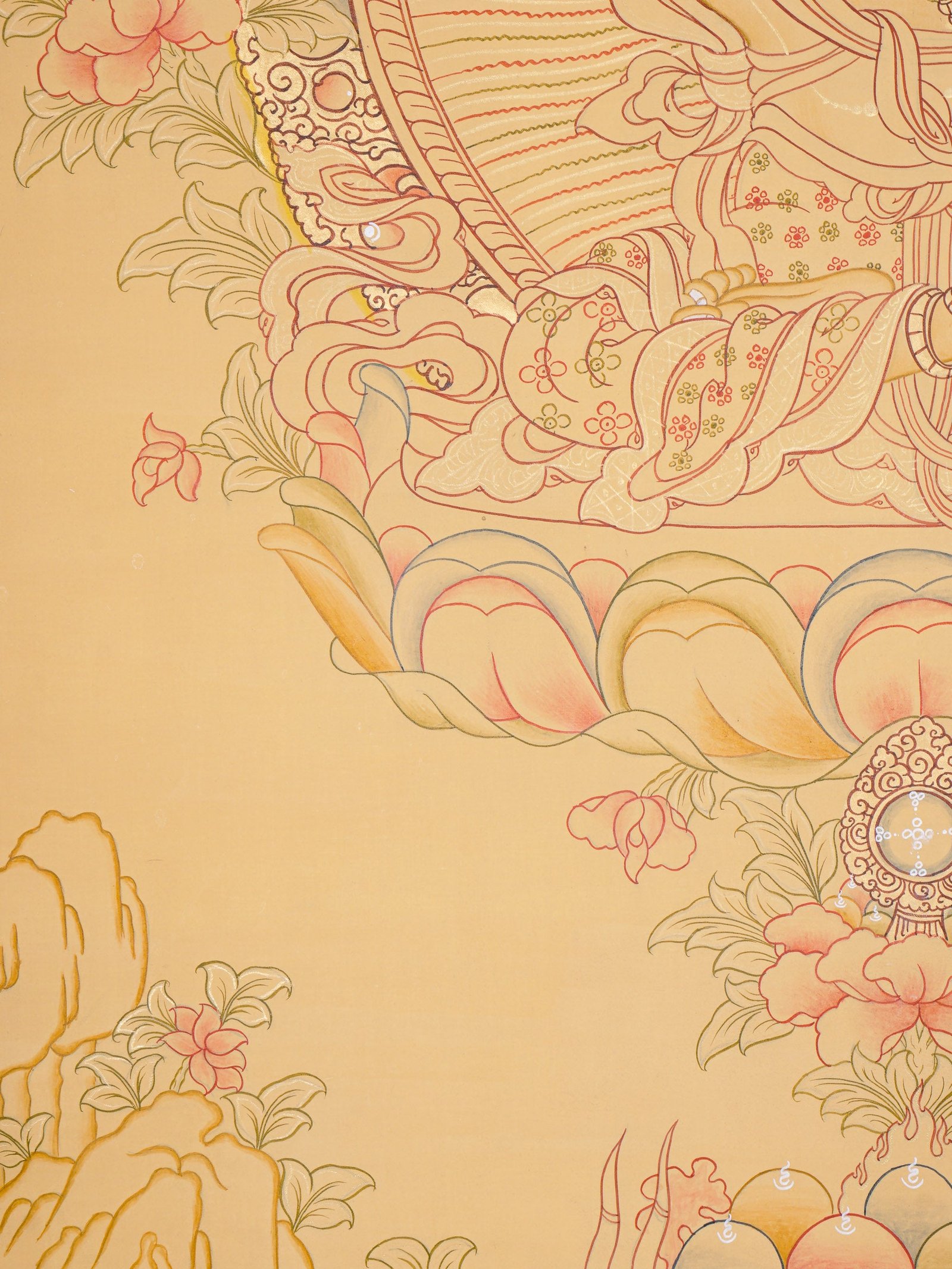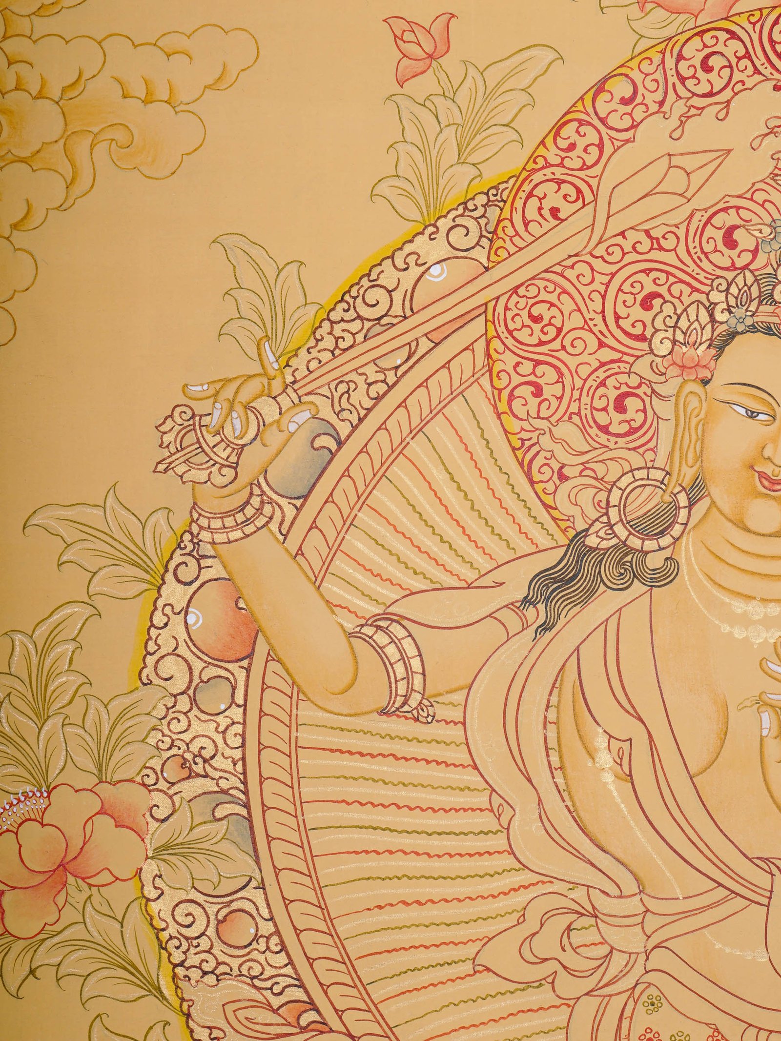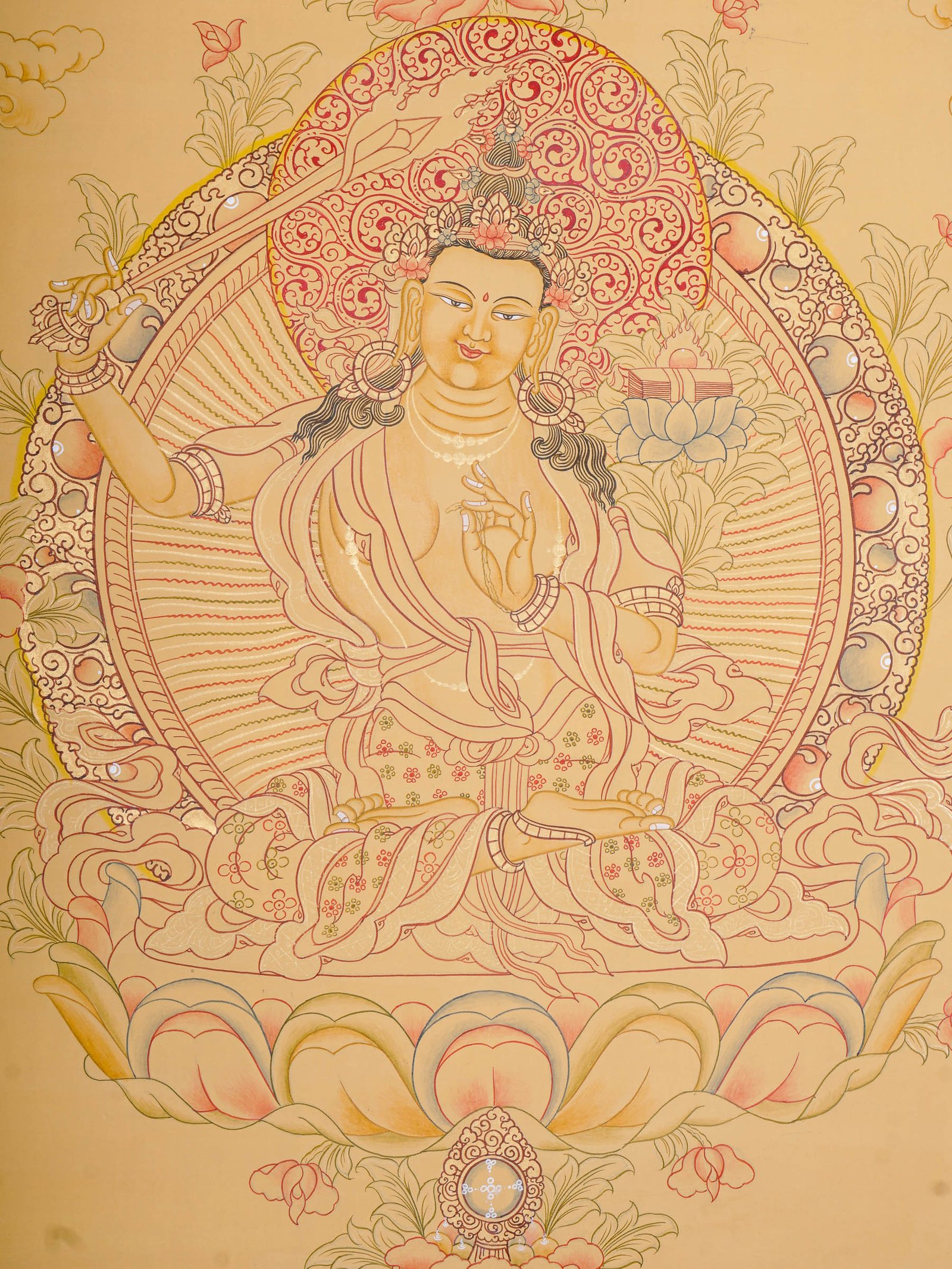 A Manjushree Thangka Painting is a hand painted Tibetan Painting that shows a visually stunning depiction of the Bodhisattva of Wisdom, revered in Tibetan Buddhism. It serves as a meditative tool and visual aid for cultivating wisdom and clarity of mind, featuring intricate details, vibrant colors, and deep symbolism.