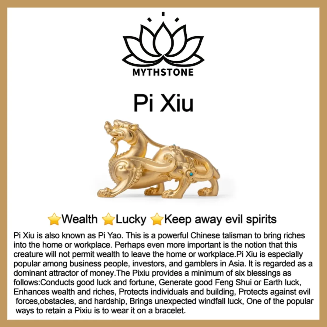 Pi Xiu is also known as Pi Yao. This is a powerful Chinese talisman to bring riches into the home or workplace. Perhaps even more important is the notion that this creature will not permit wealth to leave the home or workplace. Pi Xiu is especially popular among business people. investors. and gamblers in Asia. It is regarded as a dominant attractor of money. One of the popular ways to retain a Pixiu is to wear it on a bracelet.