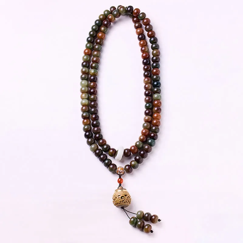 - Material: Bodhi Seed. Dzi Bead. Green Sandalwood Sachet. Red Agate