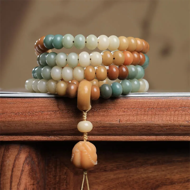 Embrace the journey to enlightenment with the Mythstone108 Mala Beads Bracelet. Crafted from gradient Bodhi seeds. each bead is a symbol of wisdom. peace. and harmony. Hand-engraved with the Buddha hand. these dark-speckled seeds serve as a powerful tool for meditation. guiding seekers towards understanding the true nature of existence.