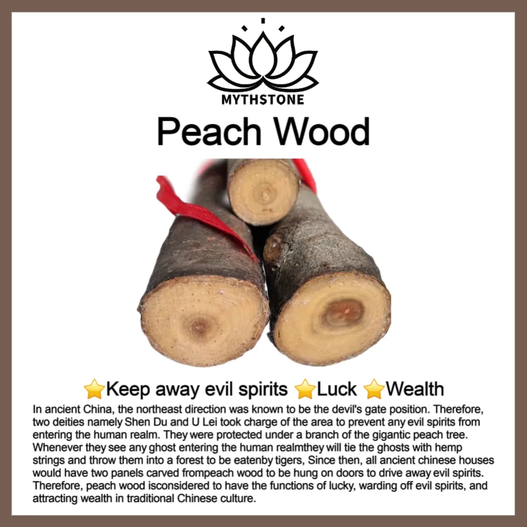 In ancient China. the northeast direction was known to be the devil’s gate position. Therefore. two deities namely Shen Du and U Lei took charge of the area to prevent any evil spirits from entering the human realm. They were protected under a branch of the gigantic peach tree. Whenever they see any ghost entering the human realm they will tie the ghosts with hemp strings and throw them into a forest to be eaten by tigers. Since then. all ancient Chinese houses would have two panels carved from peach wood to be hung on doors to drive away evil spirits. Therefore. peach wood is considered to have the functions of luck. warding off evil spirits. and attracting wealth in traditional Chinese culture.