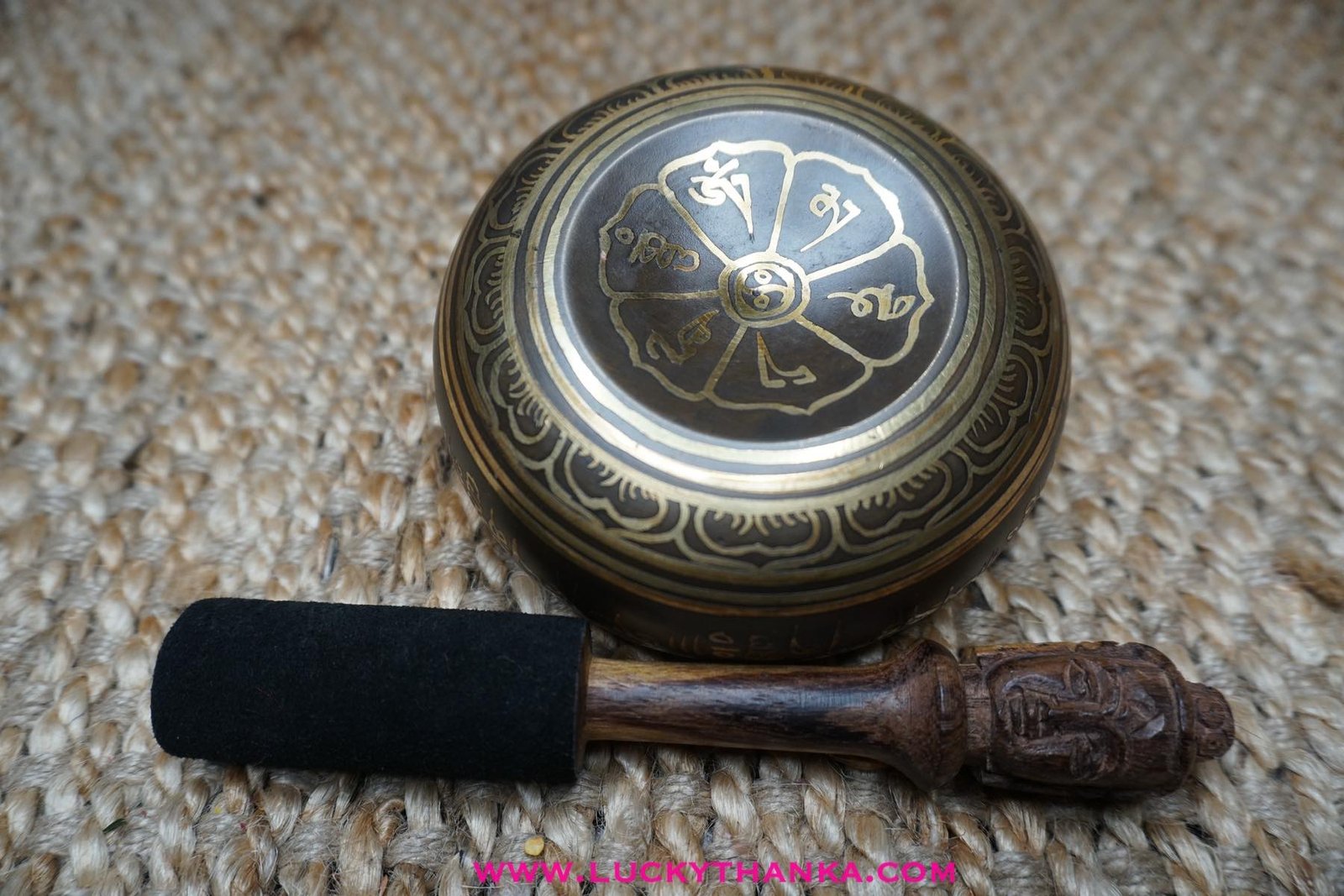 The bowl features the mantra of Avalokiteshvara: OM Mani Padme Hum, which means: