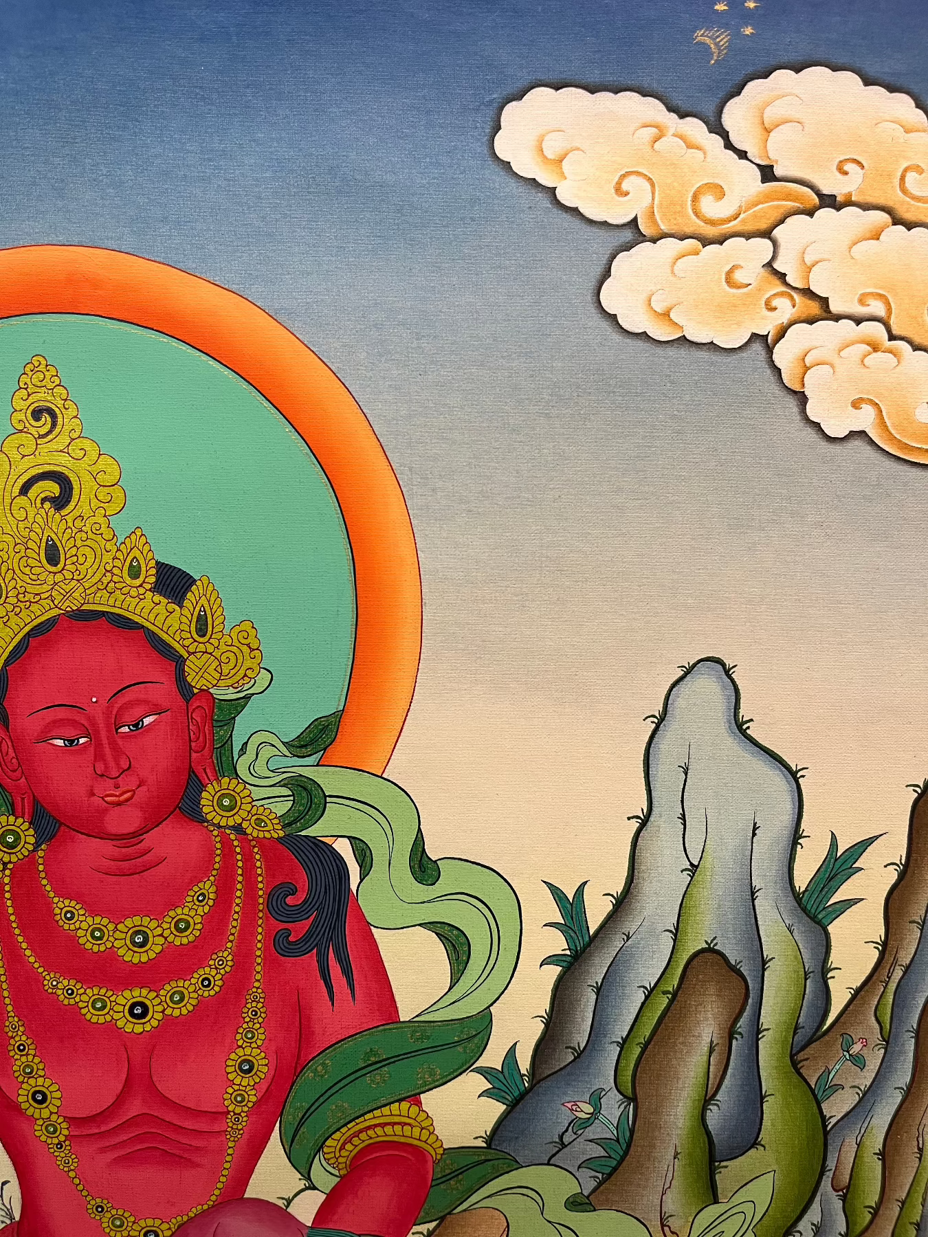 This is an original Handpainted Thangka Painting of Red Tara. Red Tara is highly regarded in Tibetan Buddhism as a powerful and revered deity, representing both compassion and protection. Thangka paintings featuring Red Tara are not just visually stunning; they also serve as powerful spiritual instruments, meant to instill devotion, enhance inner strength, and call upon Tara’s blessings for safeguarding and metamorphosis.