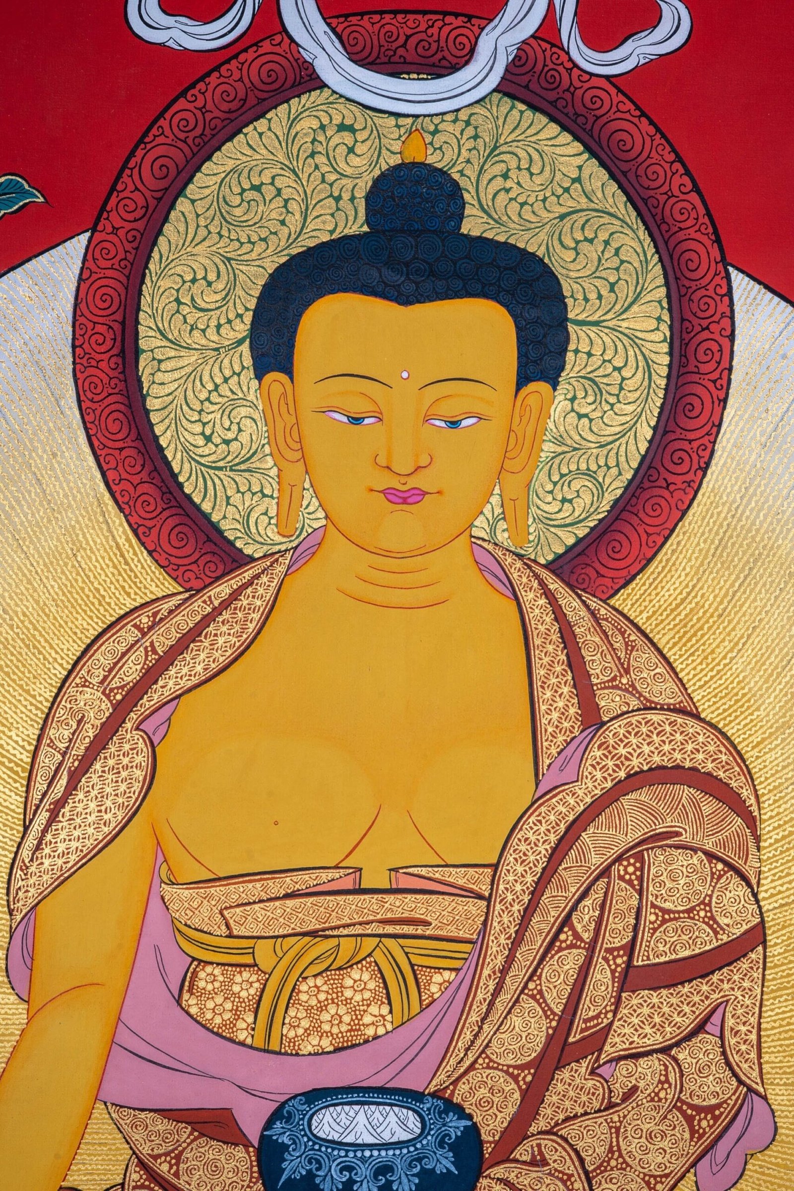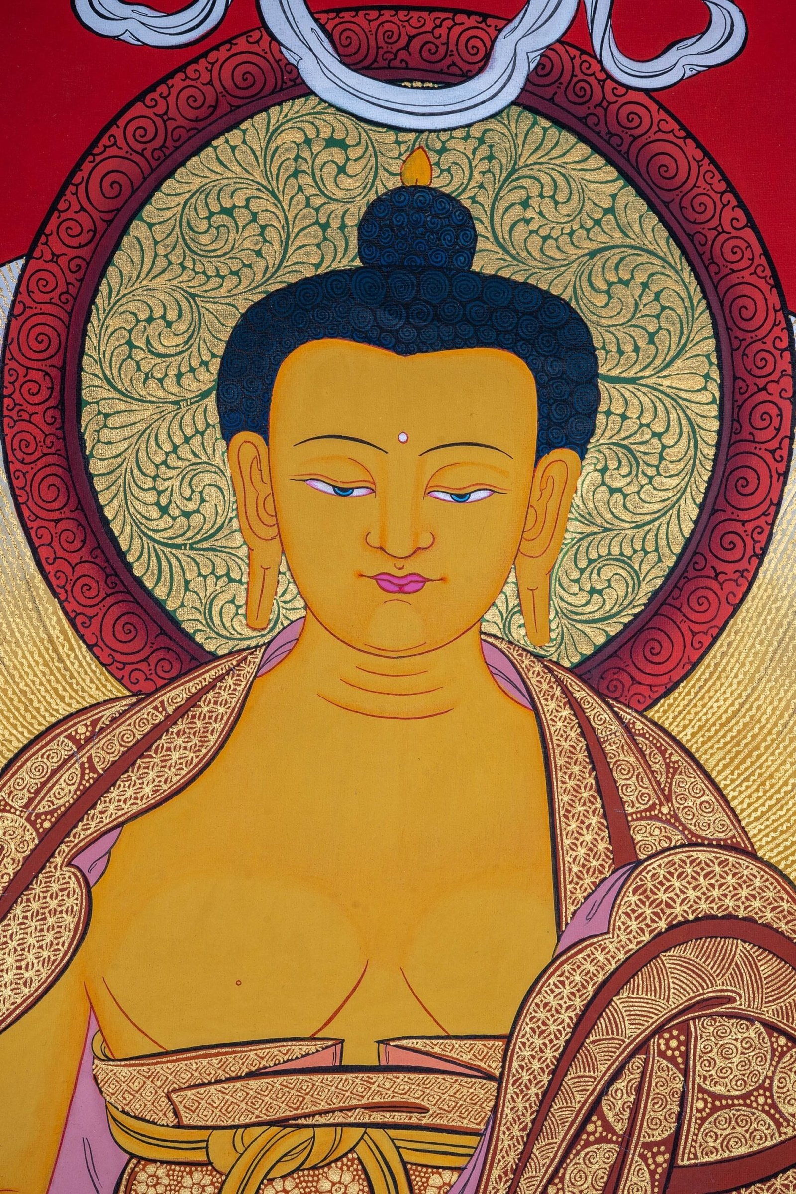 Buddhist Thangka painting depicting Shakyamuni Buddha is perfect for various home decor ideas! All our Thangka paintings and Tibetan mandala. This 100% hand-drawn Thangka painting in Kathmandu Valley, Nepal. Thangka painting can be decorated as an elegant and eccentric wall hanging in your home or office being a centerpiece of attention. It can also be placed on your family altar for meditation purposes as well as spiritual and emotional healing, attracting benevolent energy of the Tibetan Buddhist art. This is one of our best collection high quality Buddha Thangka art.