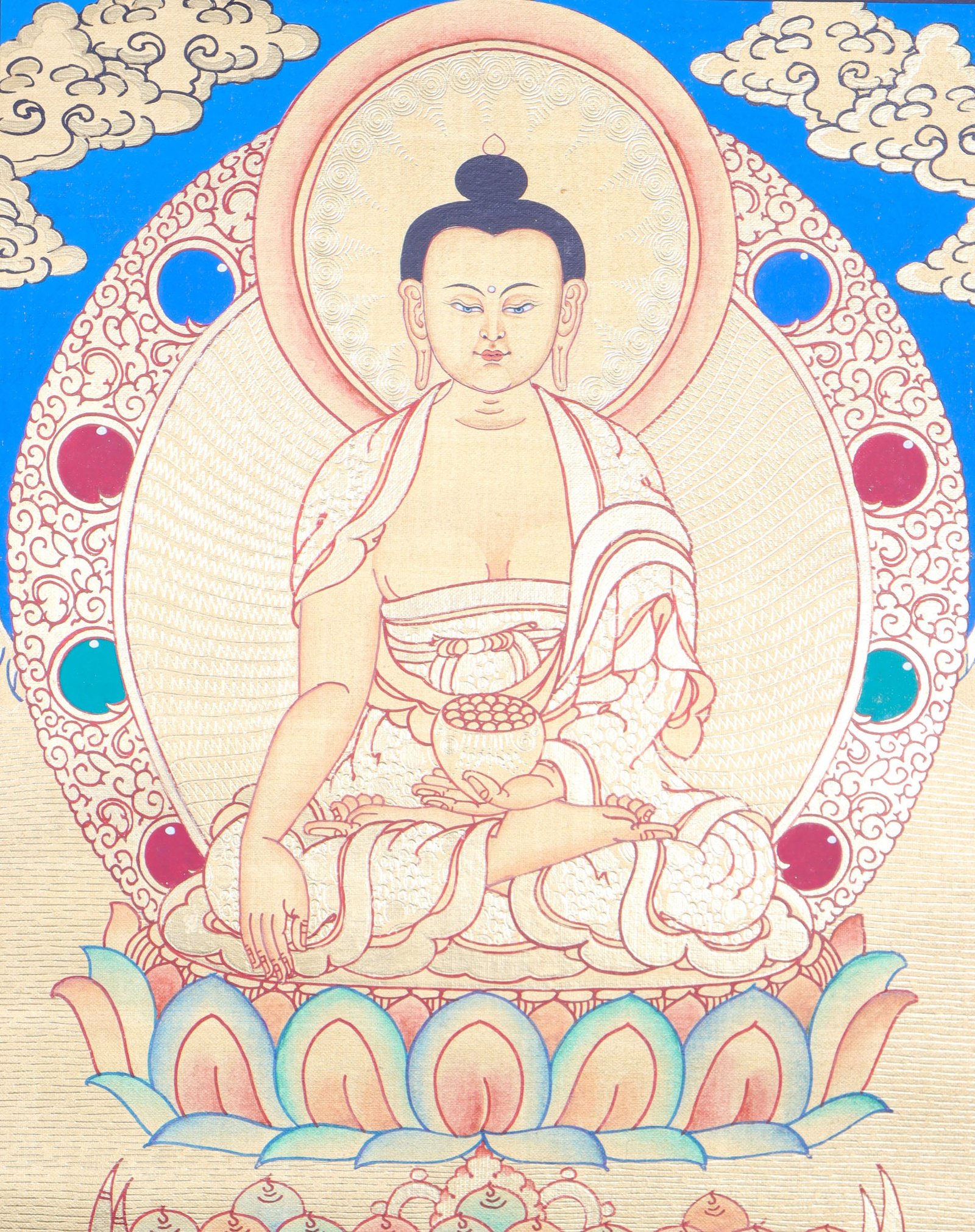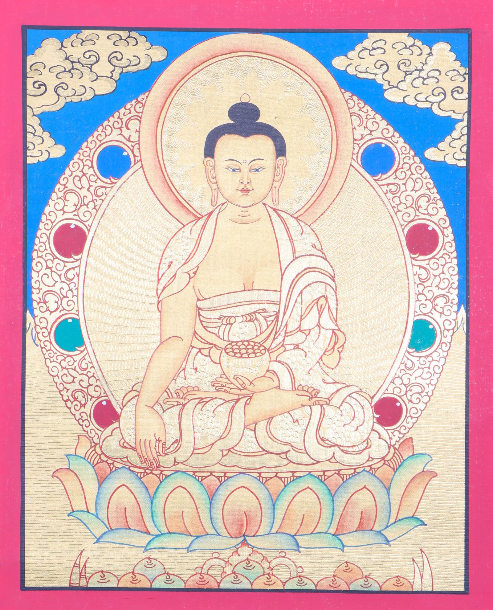 Shakyamuni Buddha ‘s teachings serve as the fundamental structures of Buddhist theology. His iconic Earth-touching gesture (Bhumisparsa mudra) is often seen in Thangka artwork, depicting his left hand on his lap and his right on the ground, indicating enlightenment. His extended earlobes and ushnisha signify his disavowal of materialism and his understanding of the ethereal realm. Thangka paintings of Shakyamuni provide a tool for meditation, aiding in the visual recognition of his teachings.
