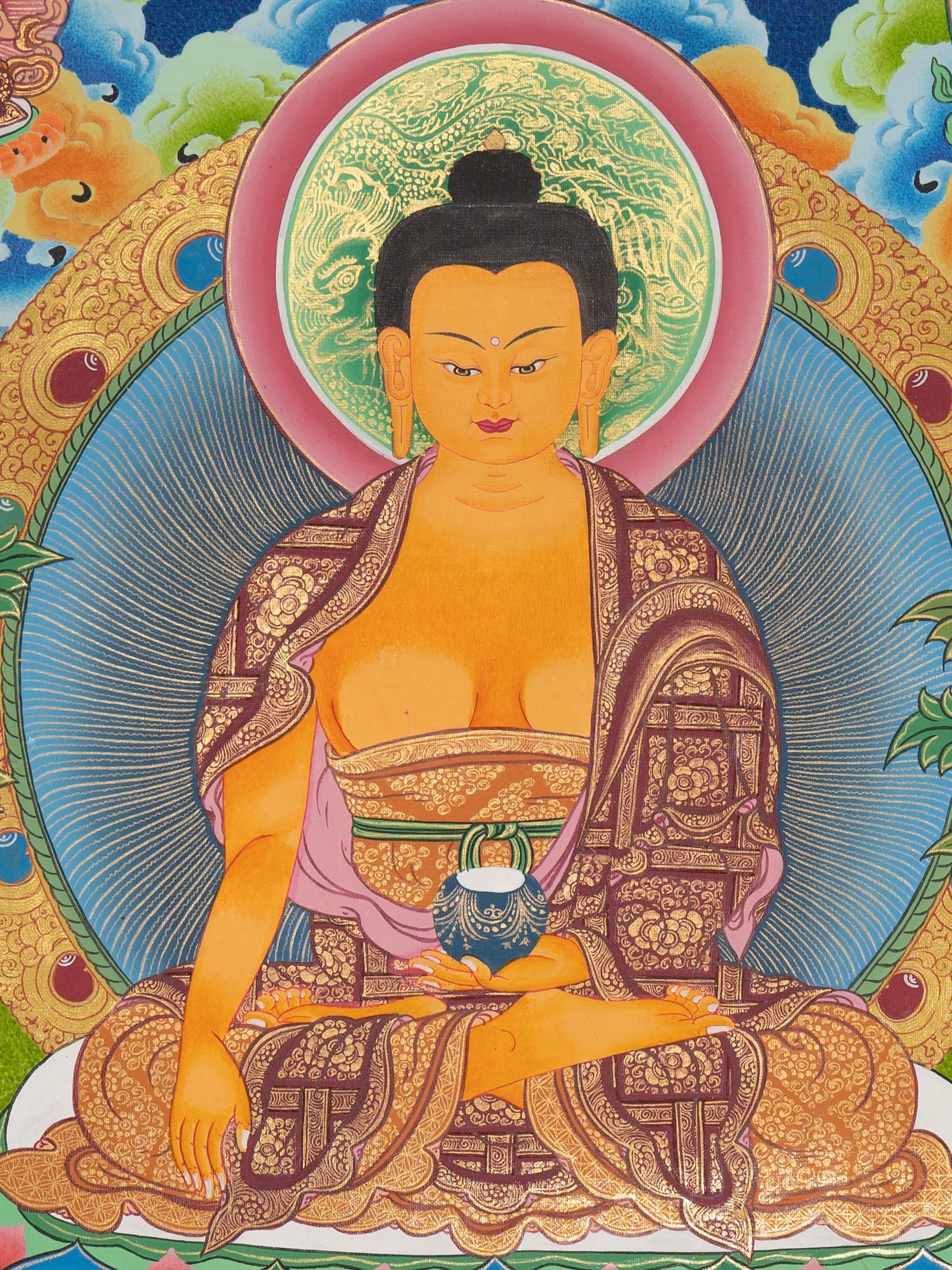 This hand-painted Tibetan Shakyamuni Buddha Thangka depicts the historical Buddha at the moment of his enlightenment, seated in meditation on a lotus throne. His hand touches the earth, symbolizing unwavering determination and the victory of wisdom over ignorance.