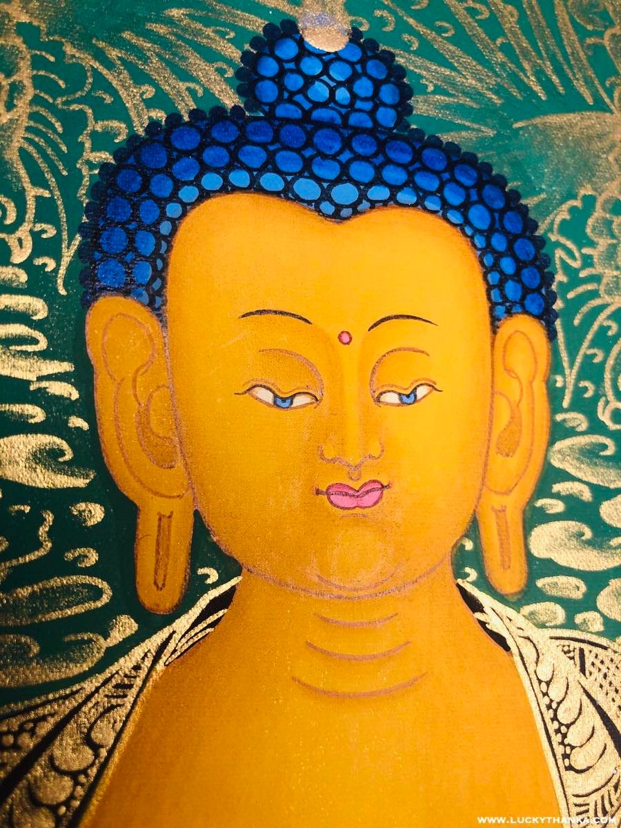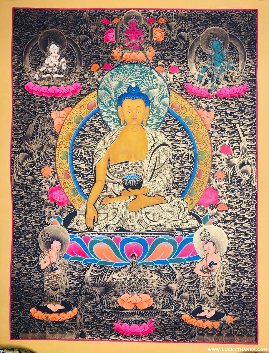 Buddhist Thangka painting depicting Shakyamuni Buddha is perfect for various home decor ideas! All our Thangka paintings and Tibetan mandala. This 100% hand-drawn Thangka painting in Kathmandu Valley, Nepal. Thangka painting can be decorated as an elegant and eccentric wall hanging in your home or office being a centerpiece of attention. It can also be placed on your family altar for meditation purposes as well as spiritual and emotional healing, attracting benevolent energy of the Tibetan Buddhist art. This is one of our best collection high quality Buddha Thangka art.