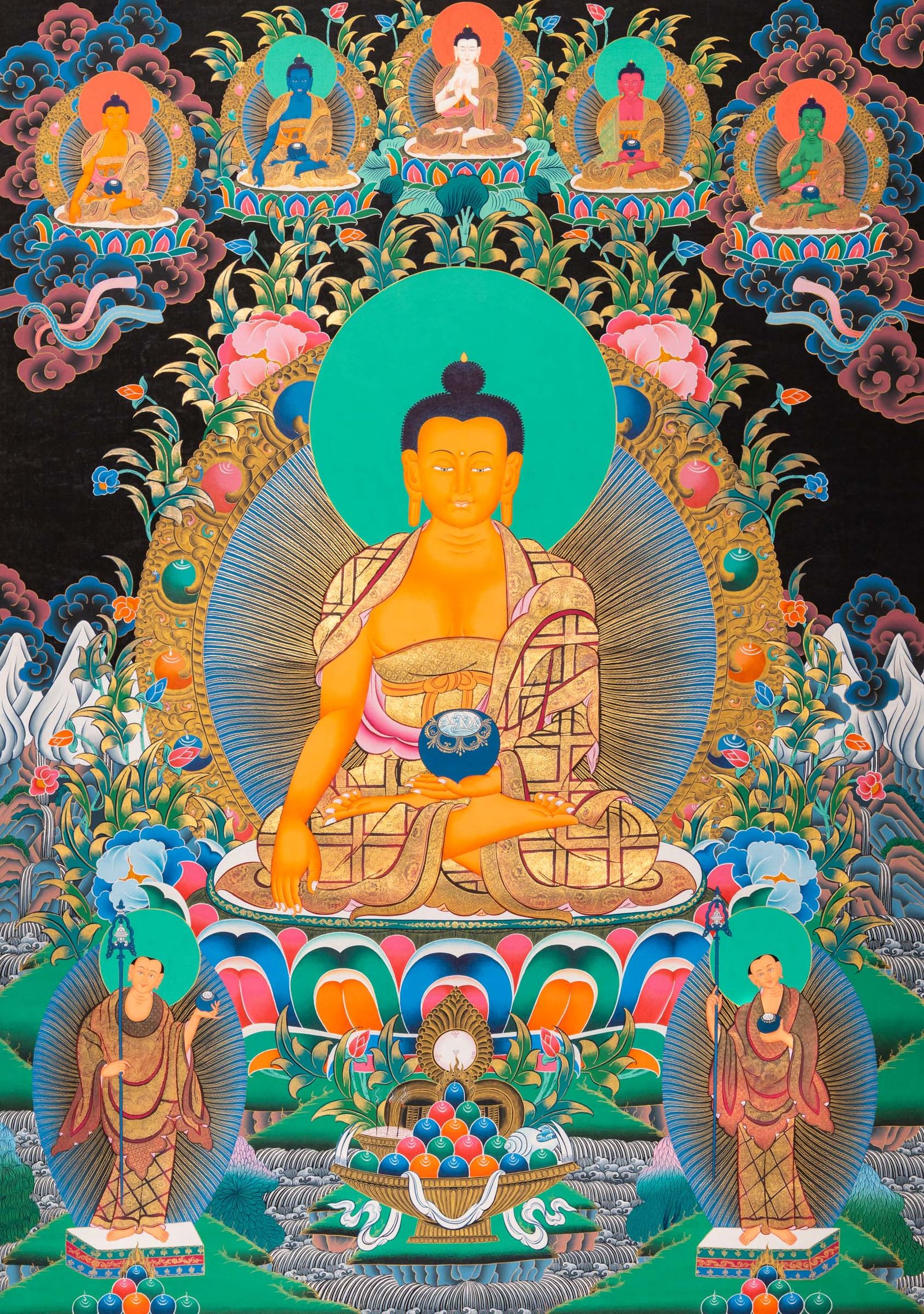 This exquisite Thangka painting of Shakyamuni Buddha conveys the essence of Tibetan Buddhist practice with its symbolic elements, rich colors, and detailed patterns. It serves as a beneficial point of focus for meditative devotion, making evident the Buddhist teachings.