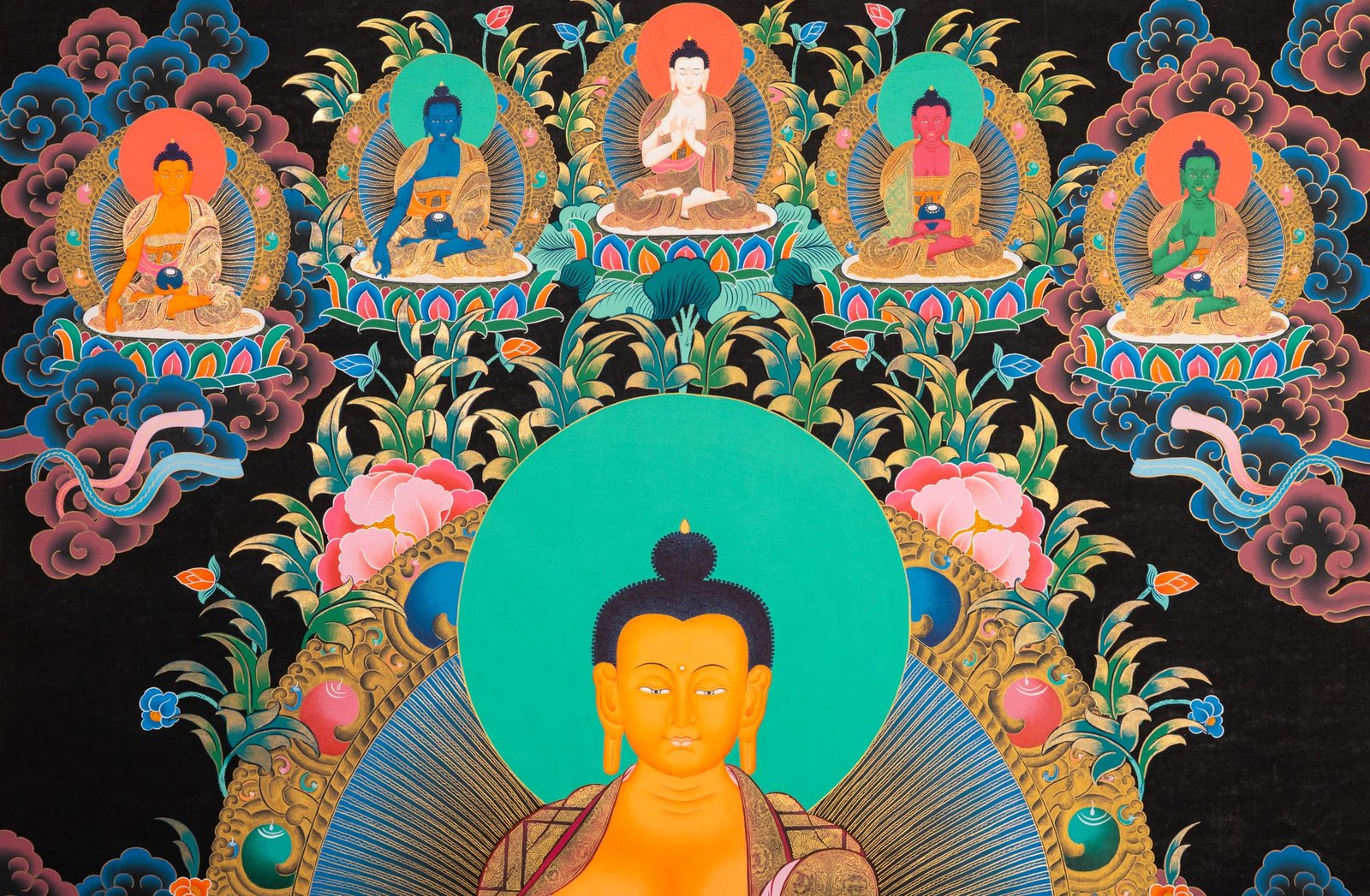 This authentically crafted Thangka is an exquisite depiction of Shakyamuni Buddha in his enlightened form, Siddhartha Gautama. Thangka paintings are intricate, meticulous works of art, crafted on canvas or silk, typically used for meditation, practice, and education in Tibetan Buddhist cultures.