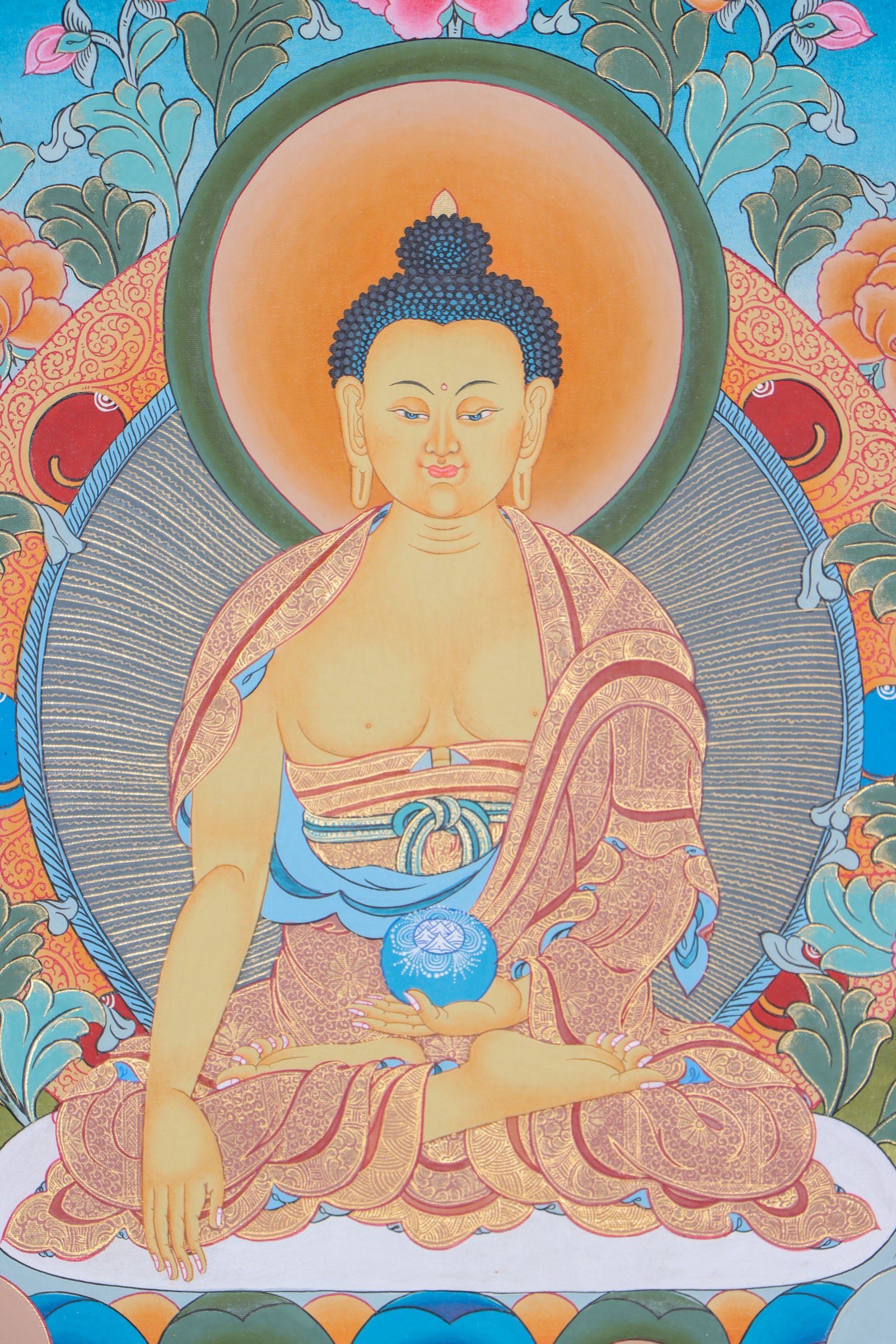 This Shakyamuni Buddha Thangka Painting portrays Siddhartha Gautama in the form of the Shakyamuni Buddha, venerated as the founder of Buddhism by Tibetan Buddhism and other Buddhist schools. It is highly esteemed for embodying the fundamental teachings of Buddhism.