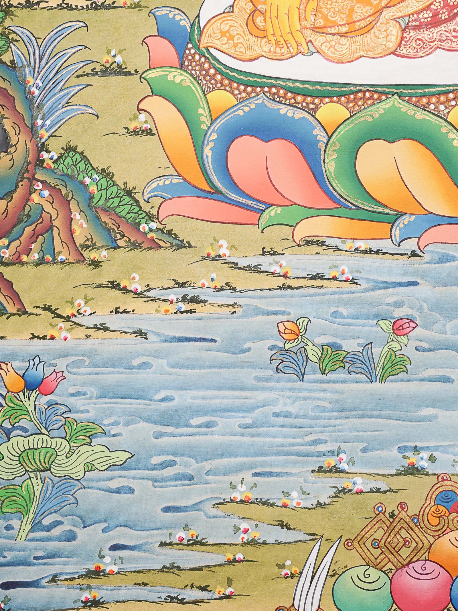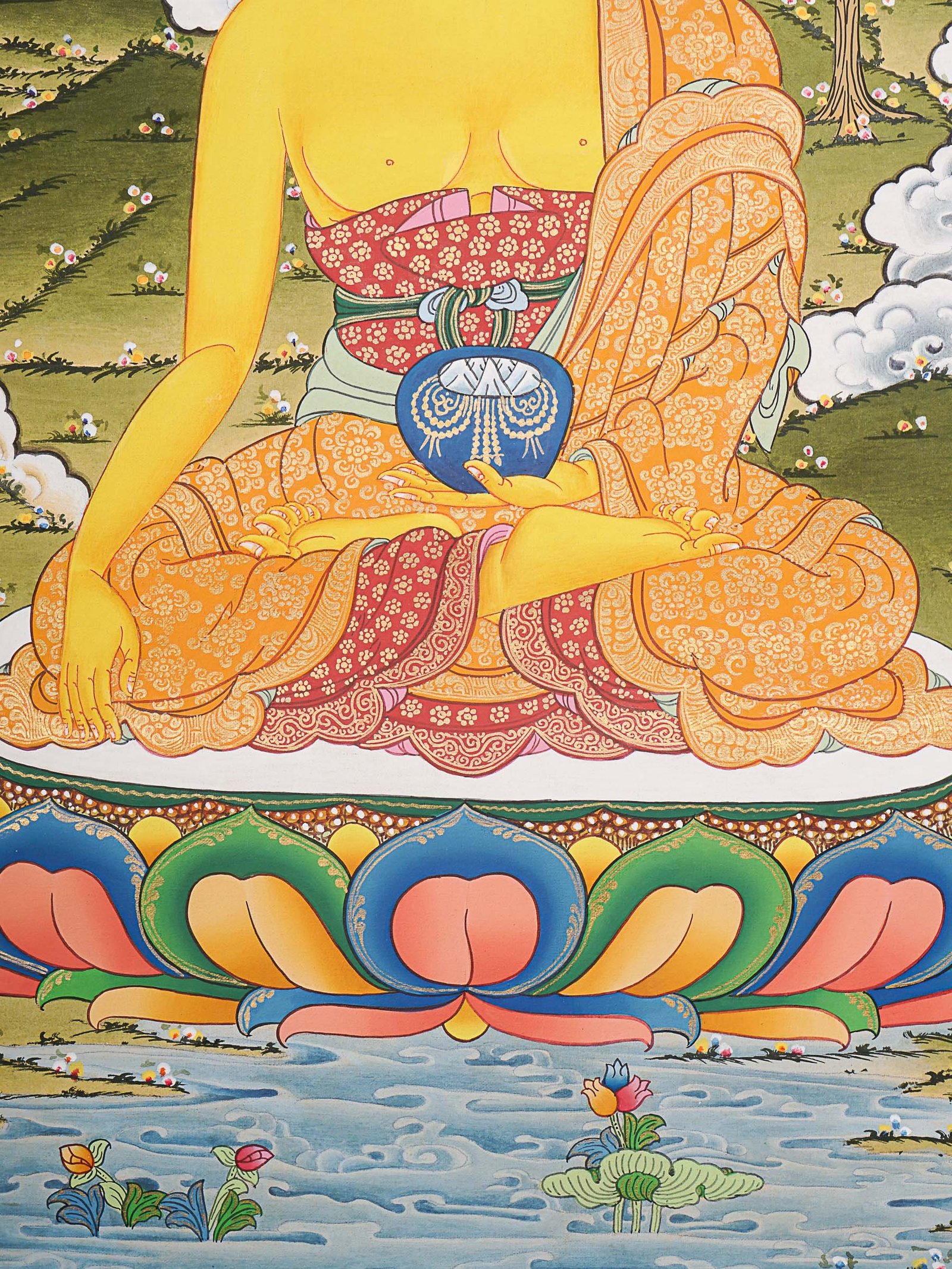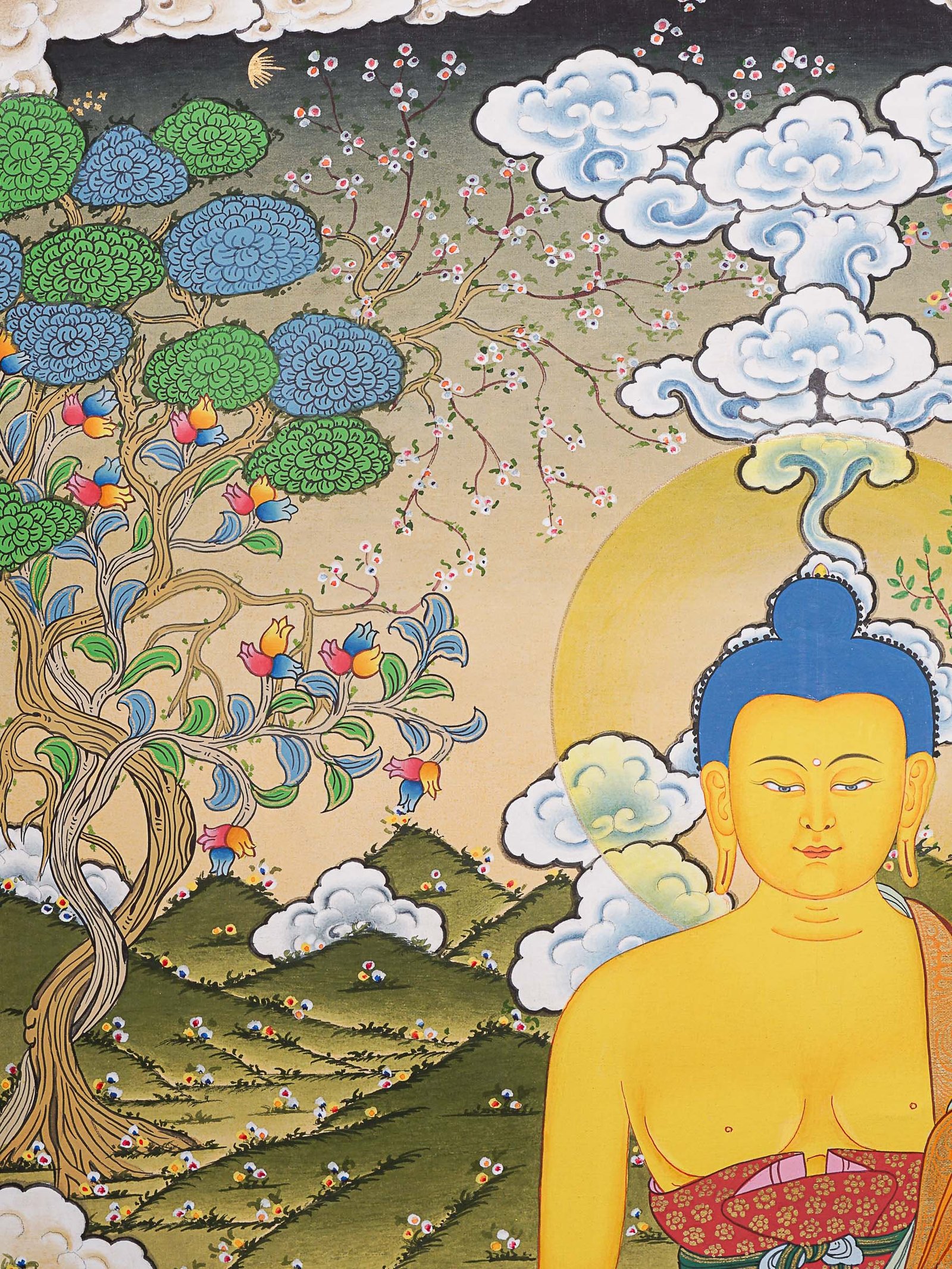 - Halo: The Buddha in this Thangka painting is depicted with a radiant aureole or halo around his head, representing his enlightened nature and spiritual radiance with a professional and educational tone.