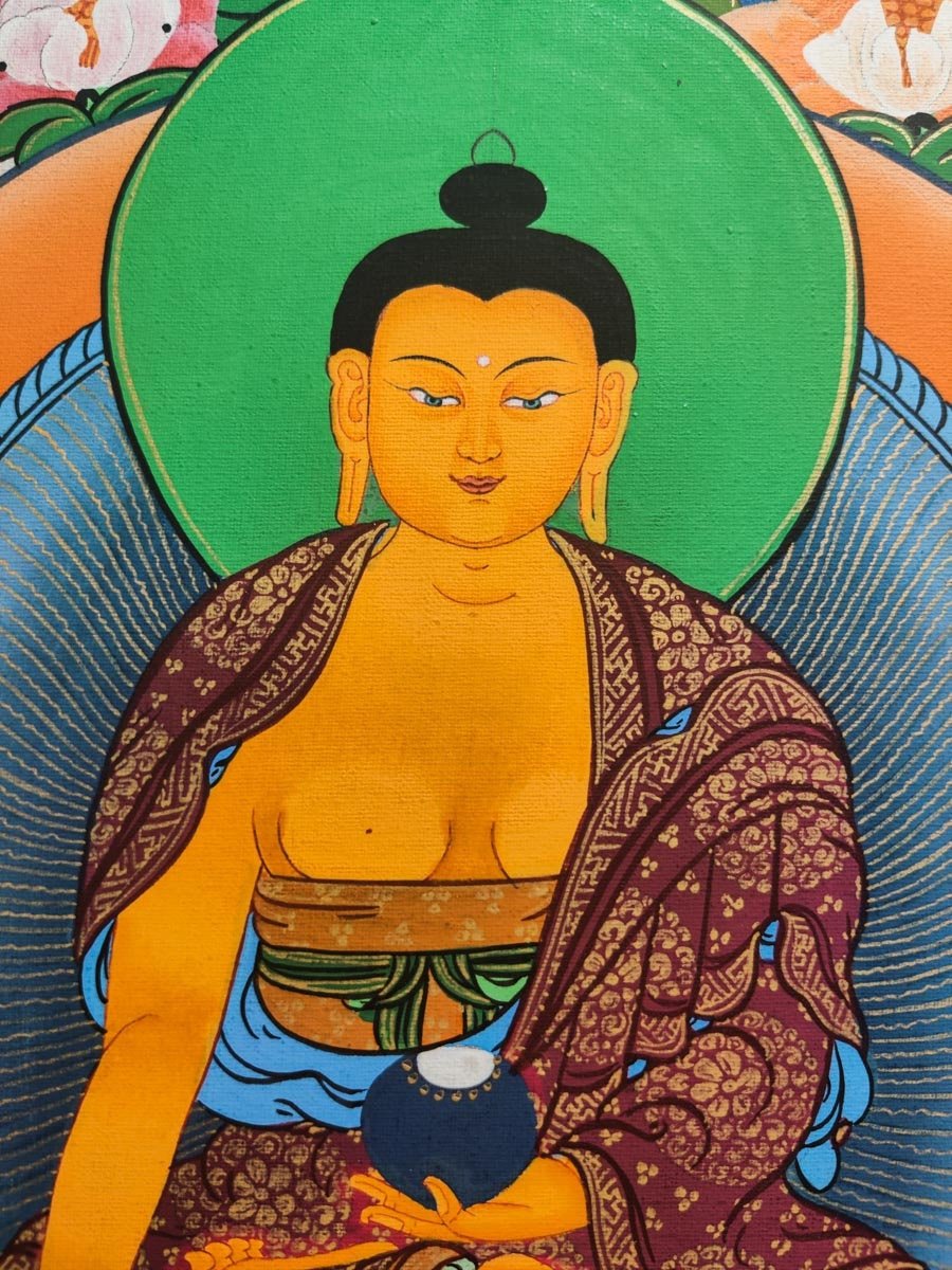 Buddhist Thangka painting depicting Shakyamuni Buddha is perfect for various home decor ideas! All our Thangka paintings and Tibetan mandala. This 100% hand-drawn Thangka painting in Kathmandu Valley, Nepal. Thangka painting can be decorated as an elegant and eccentric wall hanging in your home or office being a centerpiece of attention. It can also be placed on your family altar for meditation purposes as well as spiritual and emotional healing, attracting benevolent energy of the Tibetan Buddhist art. This is one of our best collection high quality Buddha Thangka art.