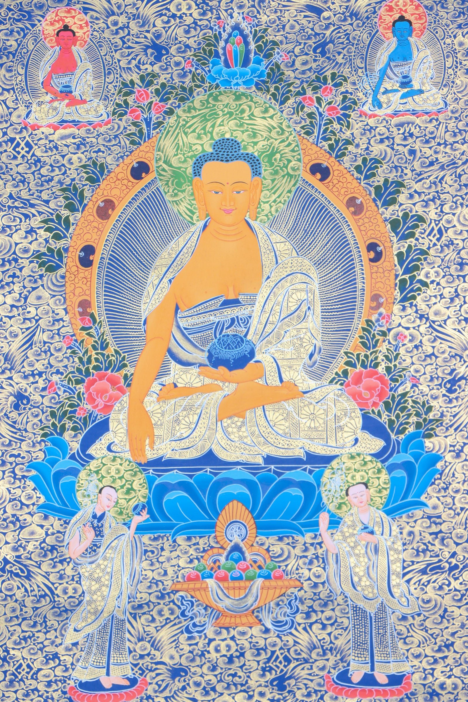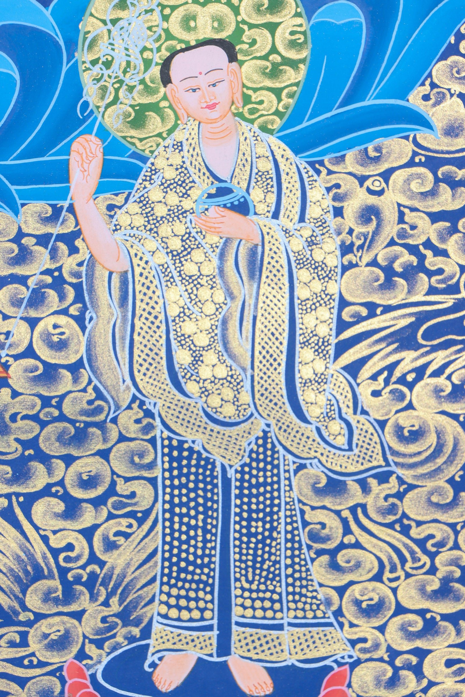 Shakyamuni Buddha is depicted in the center of Thangka painting. His posture, known as the “Dharmachakra Mudra,” presents him as being seated in meditation with his right hand pressed against the earth in an invocation of the evidence of his enlightenment. This Shakyamuni Buddha Thangka accurately displays the Buddha’s hands, which each assume a different position – each one signifying a unique aspect of his teachings and indicating particular qualities.