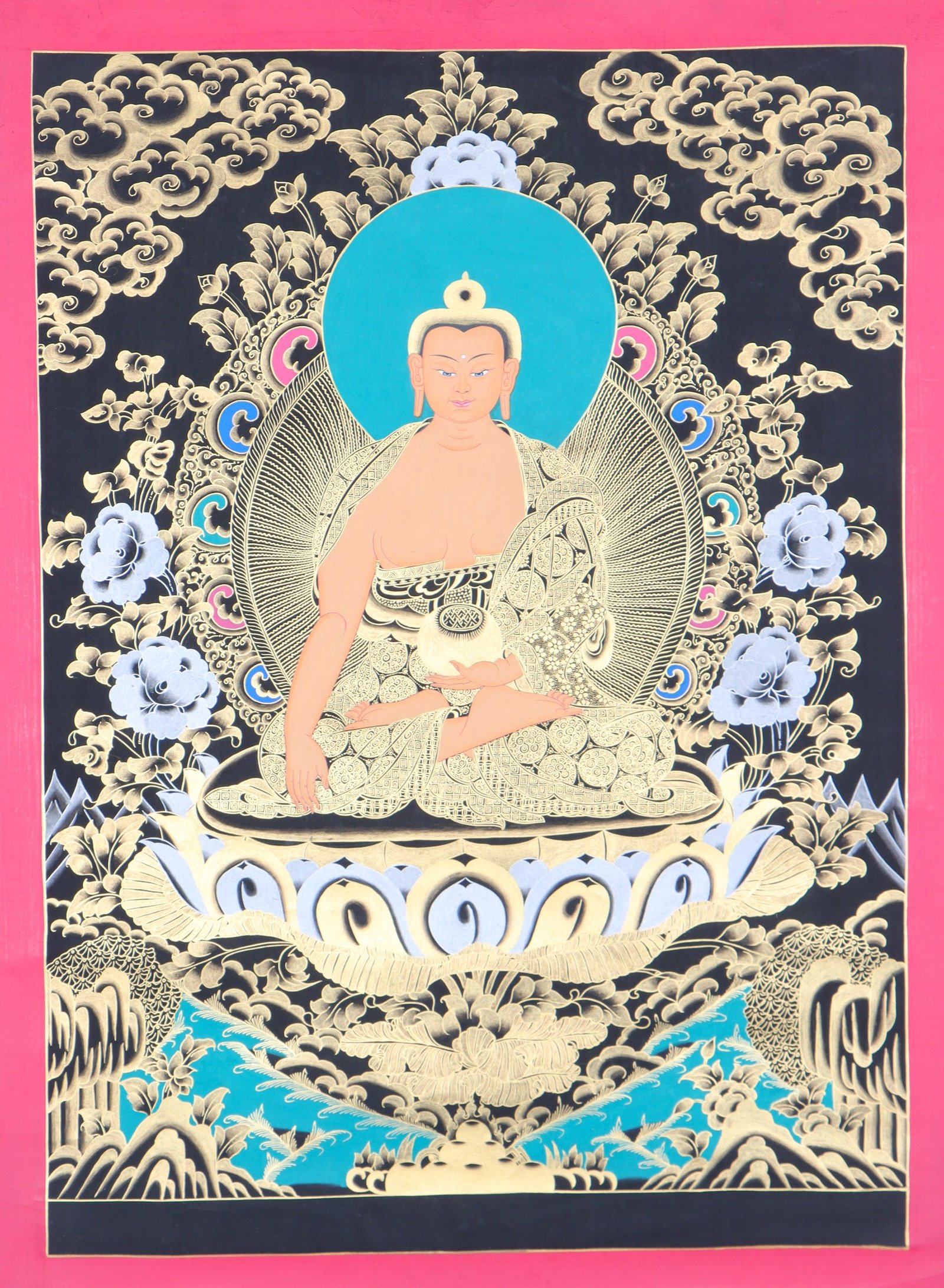 This finely-made Shakyamuni Buddha Thangka Painting features Buddha in the Dharmachakra Mudra, symbolizing his enlightenment and the knowledge attained. He is seated on a lotus throne and is displaying two hand postures symbolizing various aspects of his teachings. The painting is enriched with an intricate background featuring floral motifs and motifs of various styles.