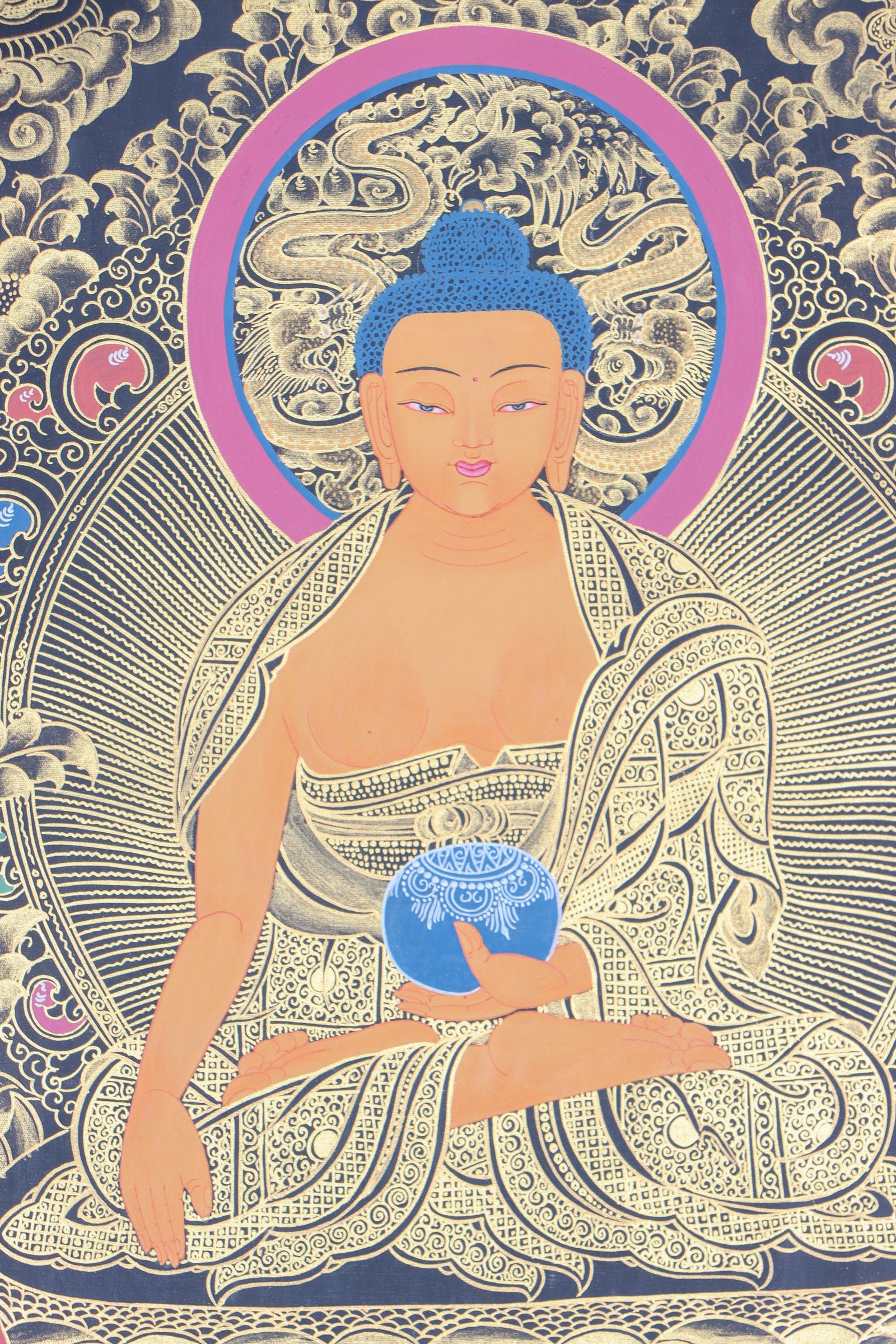 The Shakyamuni Buddha Thangka Painting is an iconic form of art from Tibetan Buddhism. It holds a special significance in religious ceremonies and rituals, demonstrating the importance of the historical figure of Shakyamuni Buddha in the Buddhist faith. This painting showcases Shakyamuni Buddha in the dhyana mudra, with his right hand in the bhumisparsha mudra and his left hand holding a bowl. The intricate details of the painting are meant to accurately portray the traditional image of Shakyamuni Buddha, from his ushnisha to his robes to the associated symbols.